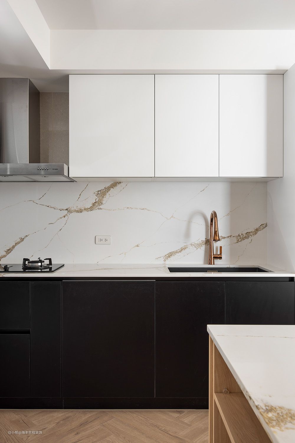 采用易清洁保养的帝雉石,铺叙於中岛台、烹饪区立面,在简洁白净台面上,蔓生几道流线金色纹理,轻泄熠熠光泽,悄悄幻亮了餐厨两域。