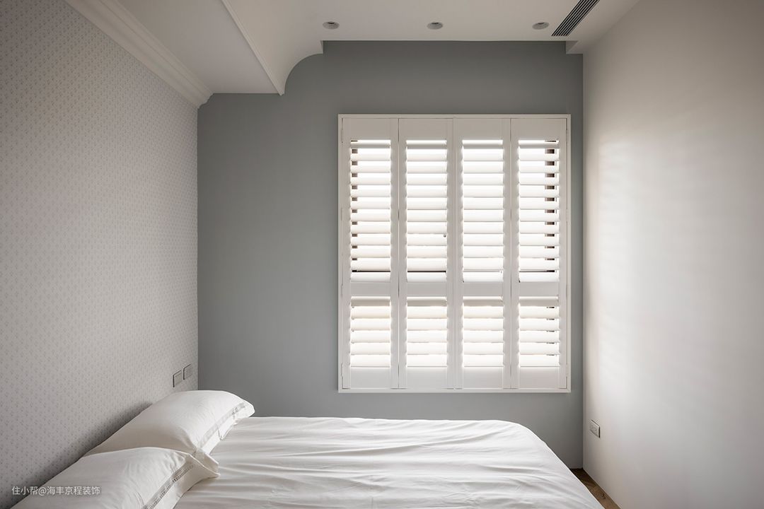 铺叙一段从欧美选购的淡蓝壁纸,仿若梦幻蕾丝纹理,重复交叠着小少女的绮丽美感,映照着光从百叶窗框流泄,床头上方再翻折下一道圆弧角,恰好修润了两道厚实压梁。