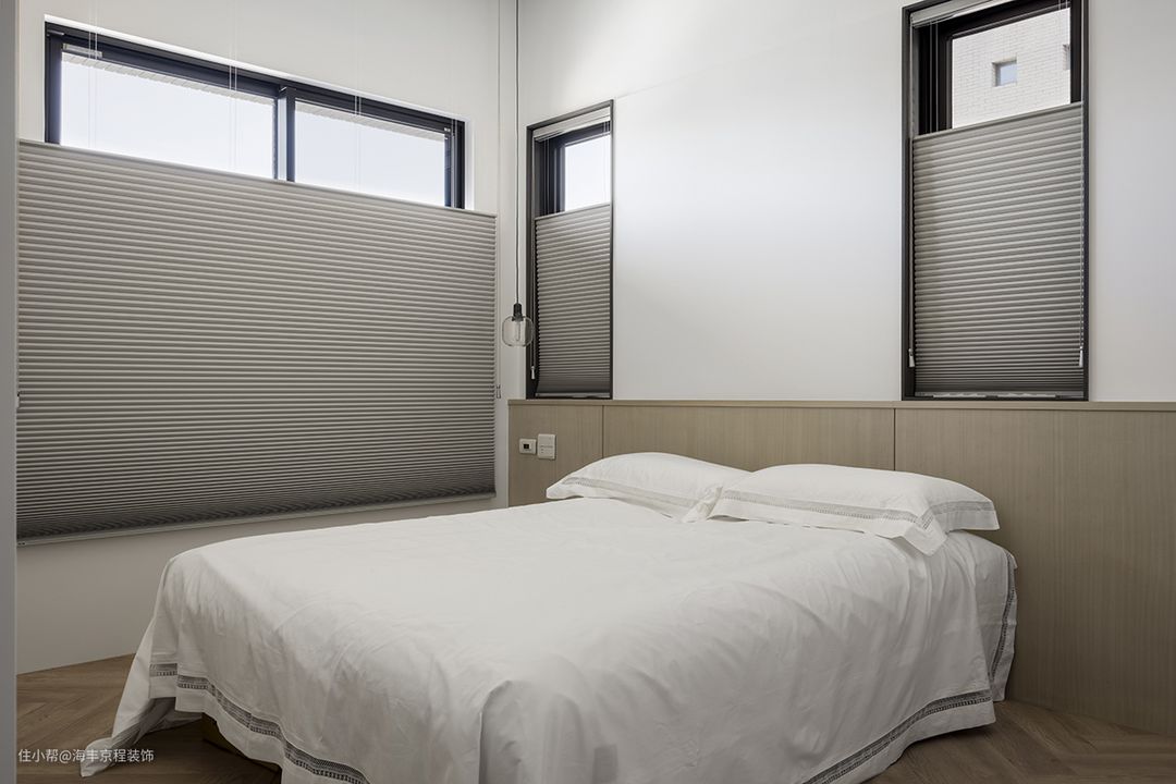 考量主卧床背墙两侧窗框台度,仅高 100 公分,因为较为低矮,双扇铝窗又是不对称形式,便巧用黑铁件包覆边框,并且穿引风琴帘,修饰了原始背墙之不善,并赋予小法式风情。