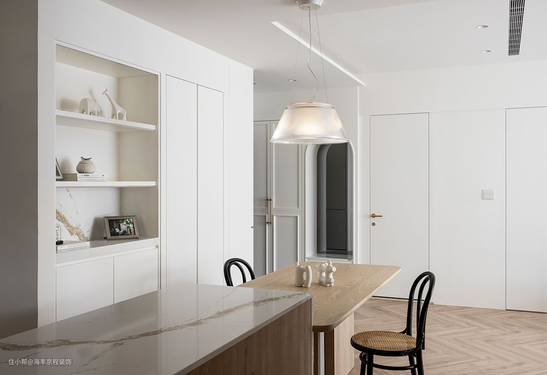 用餐区联动于中岛一侧,中岛台则与一字形烹饪区,连展为开放式餐厨,为了勾勒全然通透的状态,材质流动于白系、浅系石材、原色木纹之间。