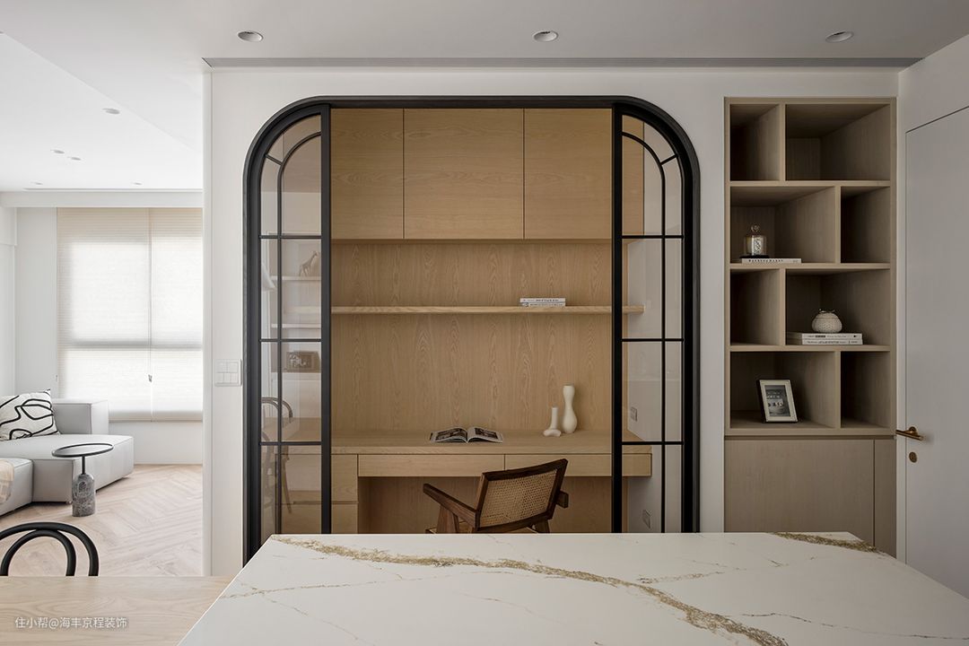 盼望给予正读在小学的女儿,拥有一处安定、沉静学习之地,在客餐区一侧,兜围出一室书房,以法式圆拱顶造型,铸造成玻璃边框,工匠手感弯折的黑色柔弧框景。