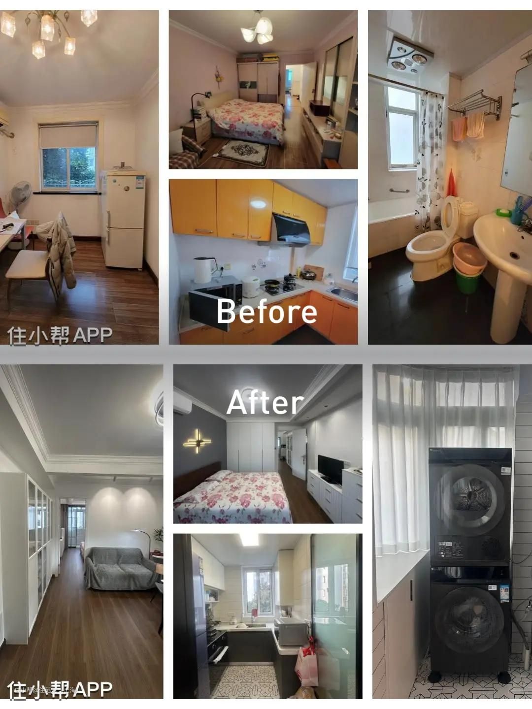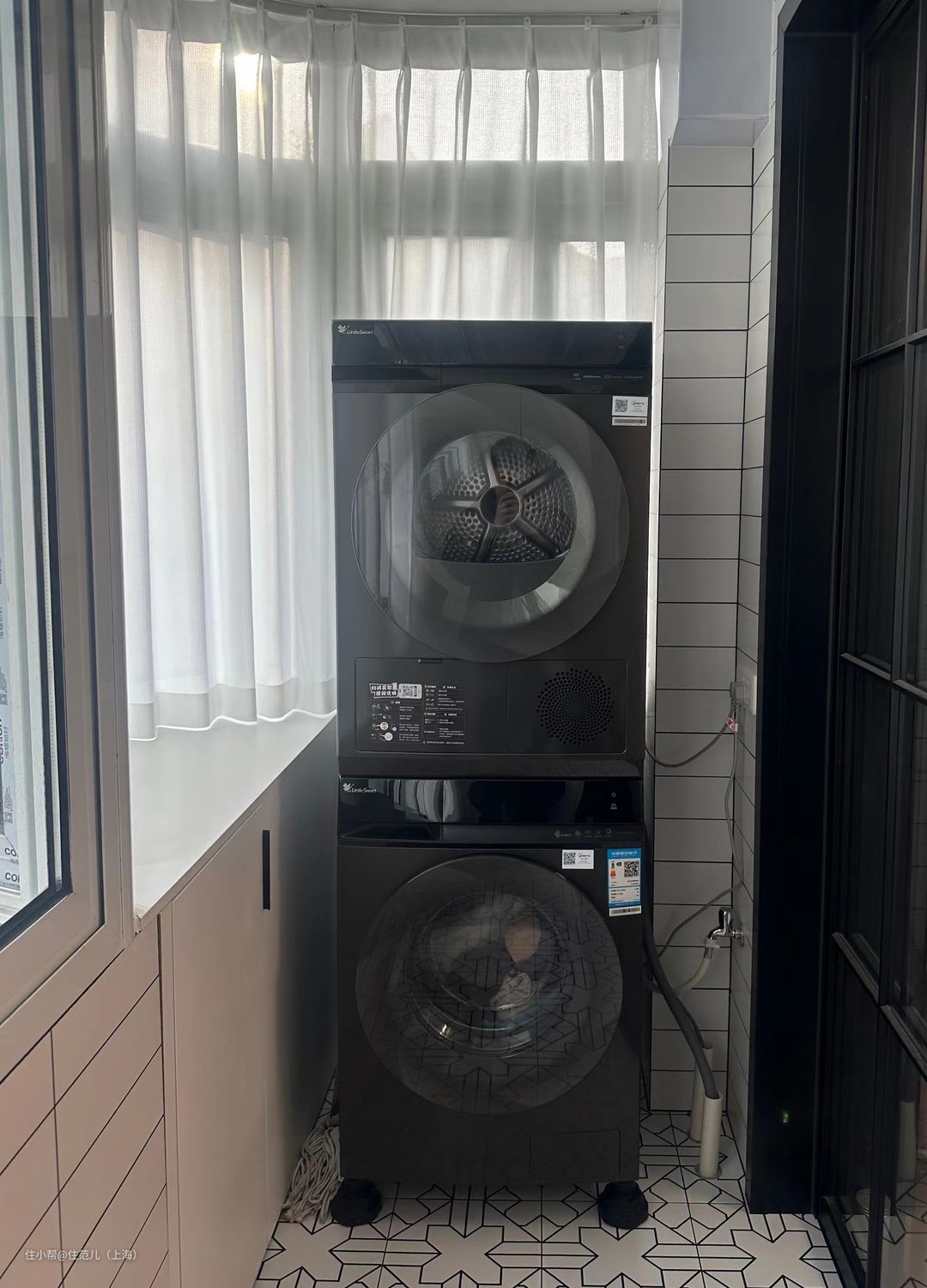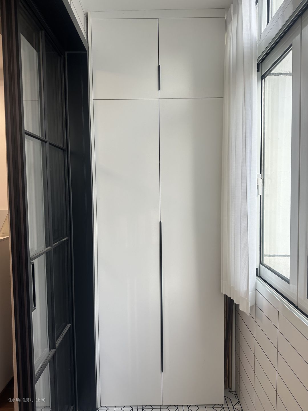 主卧阳台改造后,设计成了家务阳台。因为卫生间空间小,所以把洗烘一体放在了主卧阳台。提前做好上下水的位置预留工作,可以省去很多后续的麻烦。 原来的阳台一侧是高柜搭配开放格的书架及书桌,也是屋主的办公区,要是同时有衣服晾晒,就很不方便。 另外一侧放置了大块头的洗衣机,占空间且墩布放在洗衣机和橱柜的夹角,不卫生也不美观。 现在洗烘一体叠放,腾出来更多的空间可以活动。白色纱帘也可以很好的保护隐私,也有氛围感的调节。 这也是全屋第三个用到黑白小花砖的地方,结合厨房、卫生间地面,更和谐统一。 之前逼仄狭小的办公位置,被通顶的简约感十足的定制柜取而代之,家务阳台可以在一定程度上,提升卧室的居住体验感以及空间利用。 一个人独居,怡然自得!采光通透,现代简约的浅色系,让整个房子更加明亮温馨,布局的合理规划和调整,也更显大。屋主是那种很知道自己要什么不要什么的人,所以使用需求的满足前置,只要觉得没必要或者不符合日常生活习惯的,通通不要~ 删繁就简,拥有独居的奢侈,是很多人心之向往的生活方式,一切井井有条,一切正在发生!最后,小范儿衷心地希望,大家都可以住进理想家! 如果你在装修设计上还有一些疑惑,或者问题,甚至是需求,欢迎随时找小范儿,为大家答疑解惑~