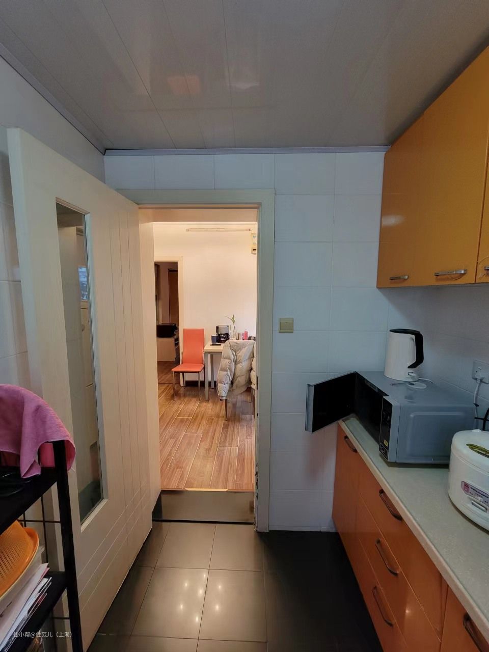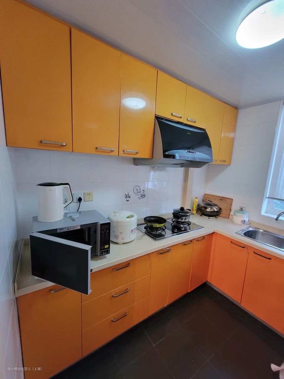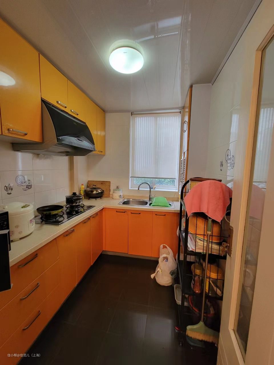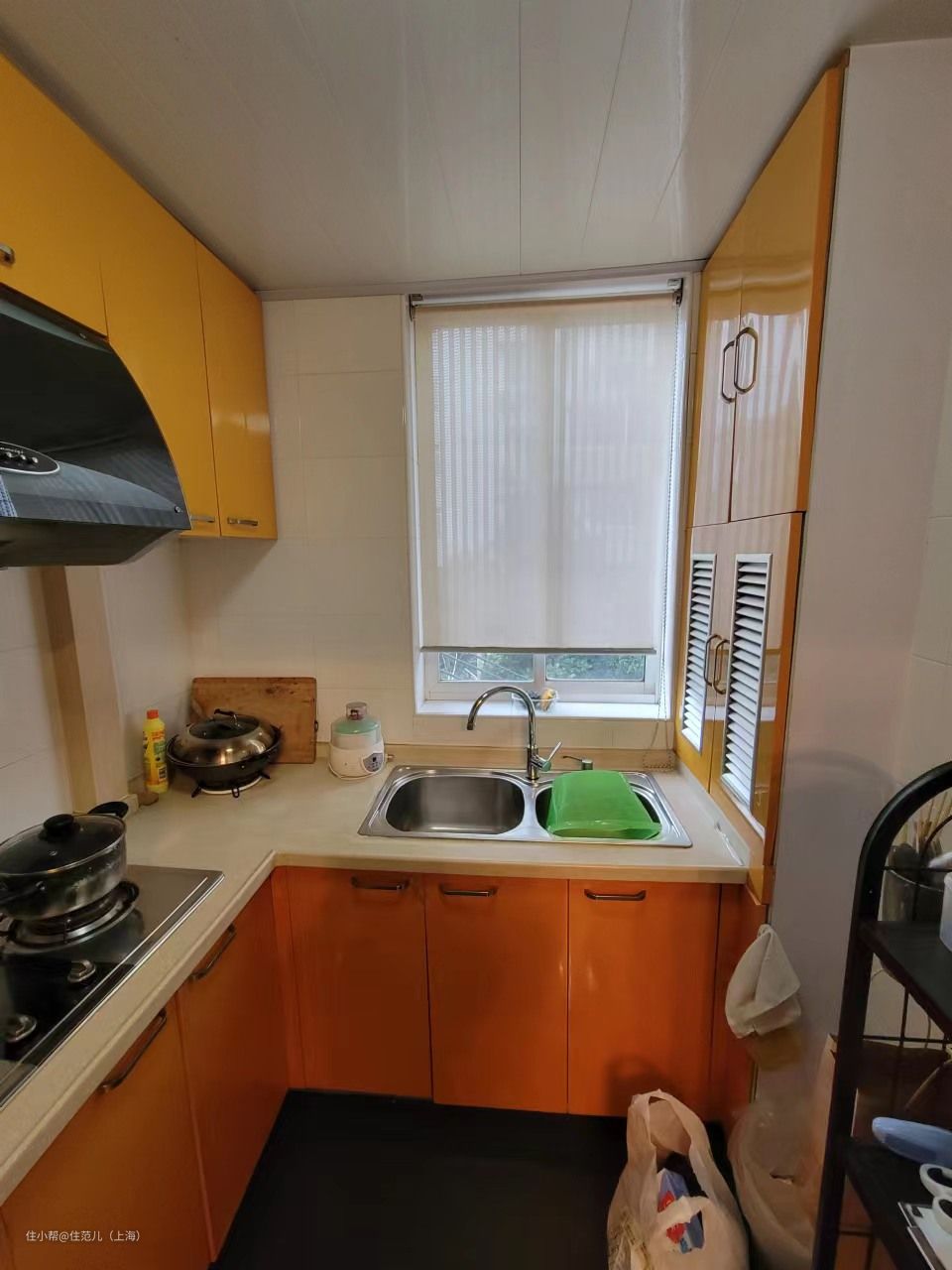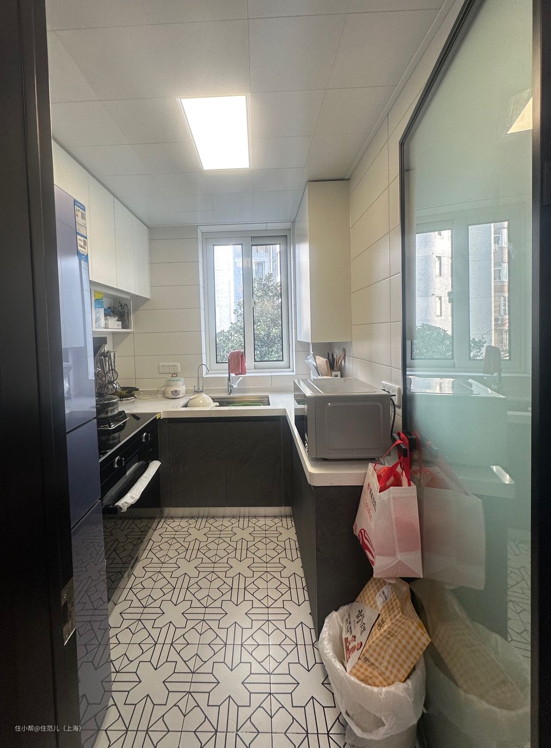 改造前的厨房是超级高饱和度的橙色系,L型厨房,地柜和吊柜的空间倒是很充足,但台面上摆上微波炉、电饭煲等小家电,就非常局促。 窗下是水槽位置,是不好用的双槽,大的锅具放不进去。一般双槽的大槽长度在40厘米左右,常用的炒锅直径在28-34厘米,加上锅把,就算能放进去也很局促。 而单槽一般长度是55-80厘米,洗锅、洗砧板都不成问题。最重要的一点是,单槽可以通过加沥水篮、沥水网、果蔬盆等实现双槽的功能。 切记:双槽买定离手,之后就没得啥改的空间了。 改造后的厨房,直接变成大U 型,动线更流畅,整体空间感也更开阔,同时冰箱也实现了厨房内置。白色吊柜+黑色地柜,质感十足。大双槽也换成了好用的大单槽。 嵌入式蒸烤箱也是不能少的,因为屋主平时还是蛮喜欢邀请朋友或者家人到这小聚,厨房是利用率很高的区域。同时,吊柜下做了开放格,取物更加方便,放置一些调料或者瓶瓶罐罐刚刚好。 热水器仍旧是在原来的位置,安置在柜子里头,遮丑的同时也增加了一些收纳空间。 地面的小花砖,让整个厨房区域和其他区域有个明显的划分,也平添了几分活力和质感。玻璃门也能有效地阻隔一些油烟及噪音,下厨爆炒就关起来,平时就直接平开,也不会特别占用空间。
