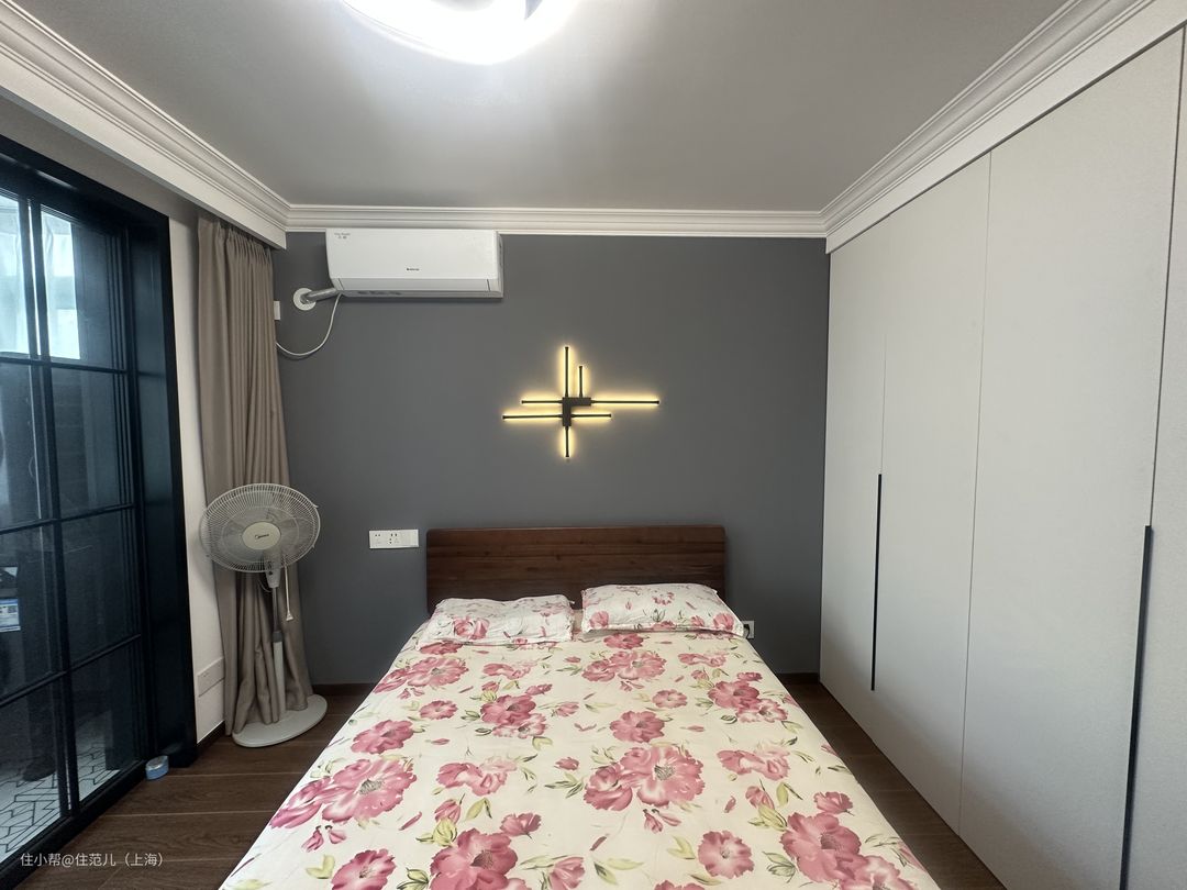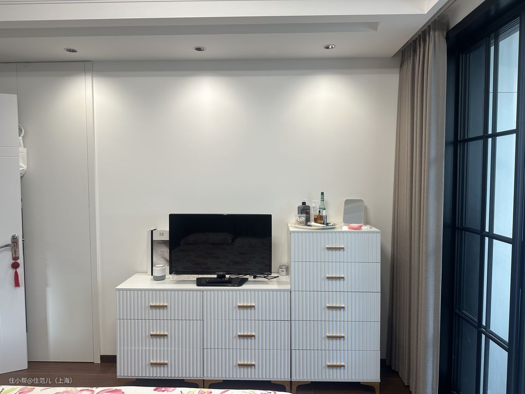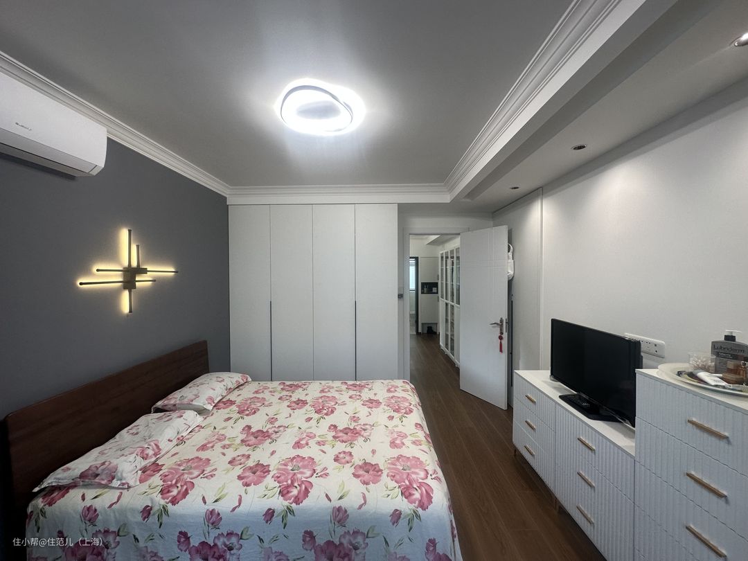原来的卧室,粉色的墙壁搭配一盏不太亮的主灯,光线上差点意思,显黯淡,老式推拉门衣柜,笨重占地。收纳空间分散,不够集中,也会显得凌乱。 改造后的卧室空间,床头背景墙改成了灰色,更有睡眠的氛围感。搭配有设计感的壁灯,暖色系的光,冷冽的气质一下子就被很好中和了。 一门到顶的定制柜,堪称收纳巨兽,独居,正季和换季的衣服足够放进去,甚至还可以有单独的次净衣区。 床尾是一组白色斗柜,足足有是一个大抽屉,收纳空间超级充足,小件的内衣或者袜子,放在这里就非常合适,拿取动线也合理。 山丘射灯也给这个区域增加了很多氛围感,也作为主灯的补充光源。电视直接安置在斗柜上,刚刚好。 床头两侧也都预留有足够的空间,后续放小边几或者床头柜,都OK。