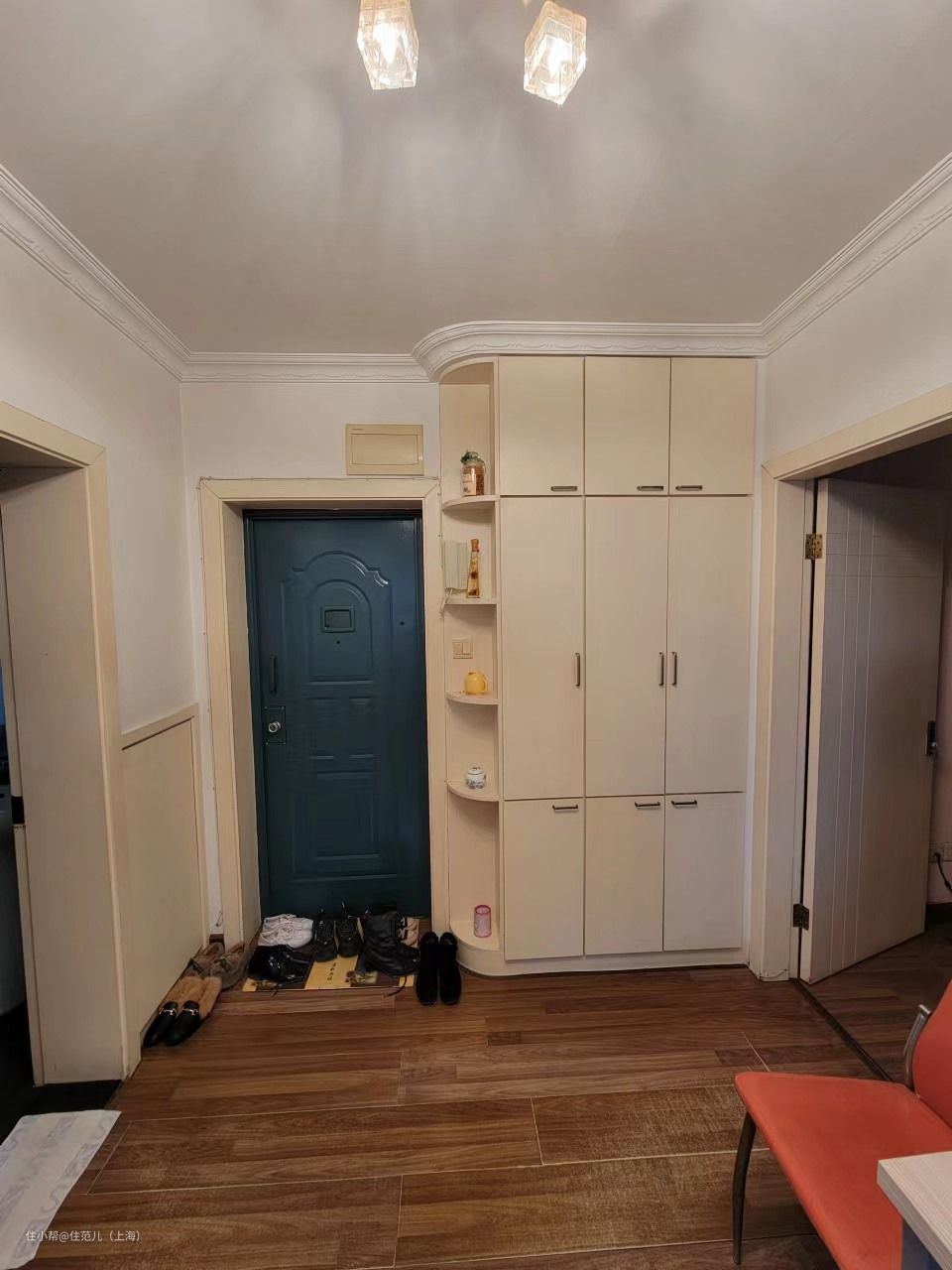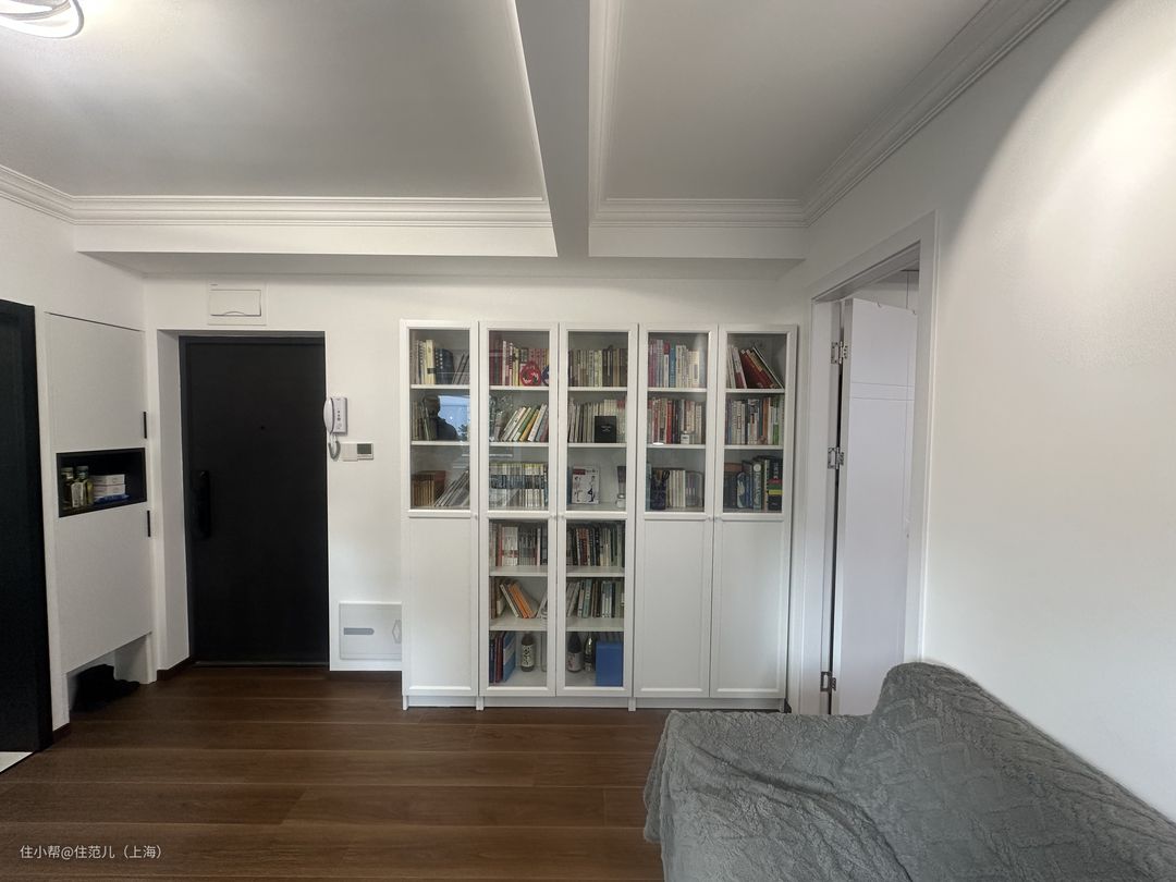 原本改造前的入户,绿色老旧的防盗门略显笨重。进门左手边沿墙做的前些年很流行的带开放格的转角柜,不太方便打扫,且零零散散的柜子视觉上不够清爽干净。 改造之后,换了黑色的防盗门,搭配整体白色系,更协调统一。进门右手边的位置,用一整面墙的白色书柜取而代之。密闭但选择了透光好的玻璃柜门,不落灰也整洁,有藏有露,瘦高长条的柜子也更能拉伸层高。 右手边沿墙做了入户玄关柜,中间镂空空间可以有更大的利用率。无把手设计,上下柜都可以容纳很多杂物,最下面还预留了放鞋子的空间,这样方便进出换鞋,门口也不会看起来乱哄哄,很规整。