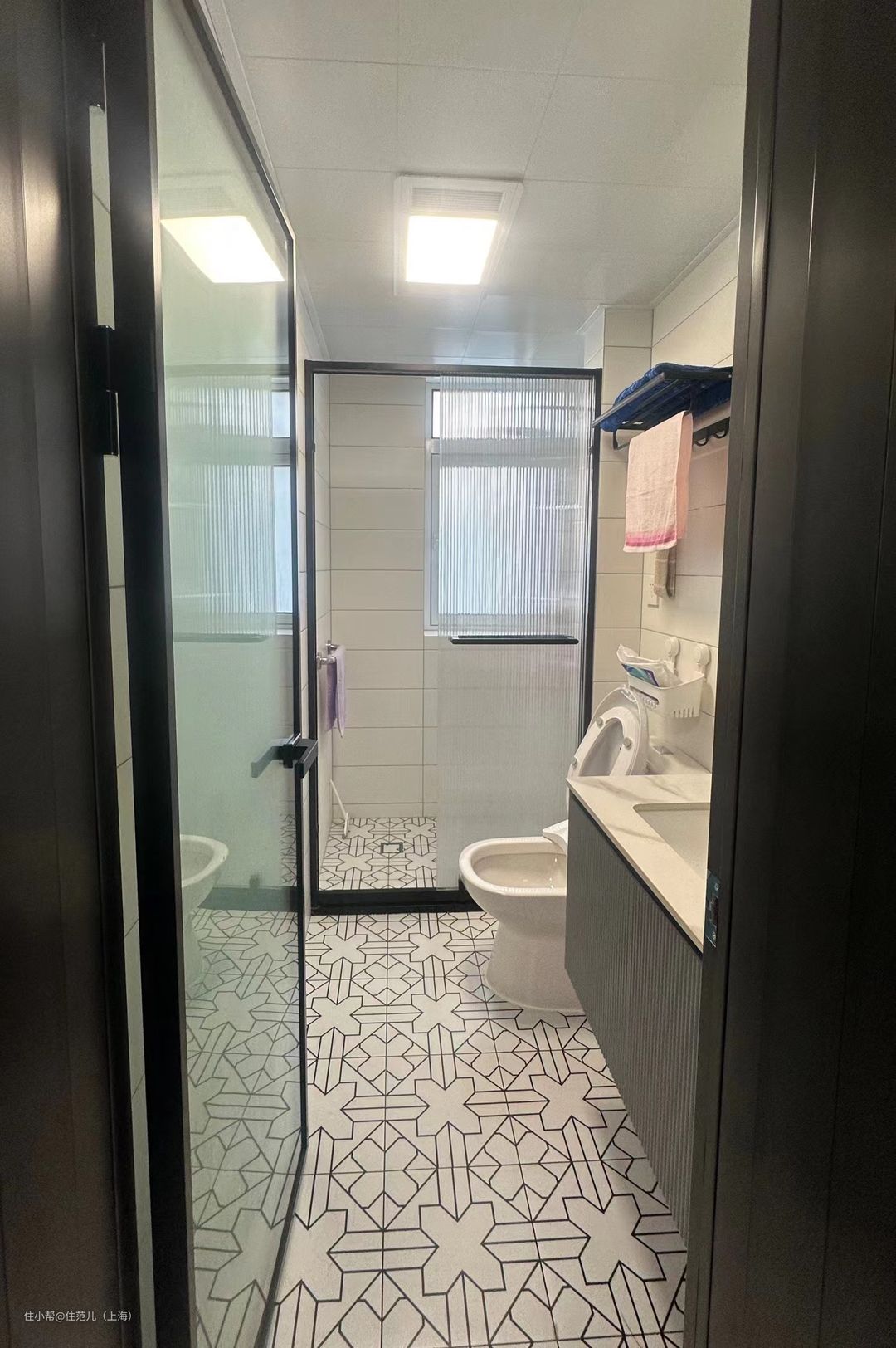 原本的卫生间,格局不够合理,也没有做明确的干湿分离处理,浴缸和马桶+洗手池以简易的浴帘分隔,如果稍有不慎,还是会将洗澡水溅出,打扫收拾也不方便。 一体式的洗手池搭配镜子的组合,非常老旧,且没有浴室柜,置物空间少了许多。 重新做了干湿分离的处理,改造后的卫生间比之前更通透显大,透光感超好的长虹玻璃作为干湿分区的分界,很凸显家居质感。 智能马桶和浴室柜搭配,承载干区的功能使用。马桶上方的毛巾架方便收纳洗漱用品,且还能杀菌消毒。 一体式台下盆清洁无死角,浴室柜下柜还有足够的储物空间,可以收纳洗漱用品、洗衣液等备用耗材。同样地,也用了黑白小花砖,和厨房地面小花砖相呼应,整体性更强。