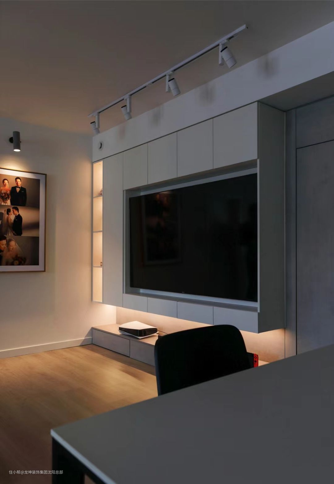 考虑到屋主无晾晒需求,所以将阳台引入客厅改造成地台,设置成休闲会客区和工作区。超大的落地窗最大限度的引进自然光,保证家居环境的通透明亮。左边靠墙设计了整面墙的储物柜,将一些不常用的物品放在此处,从此告别杂乱无章。旁边的书桌临窗而设,保证了充足光线的同时,也满足了日常孩子写作业或者大人办公的需求。