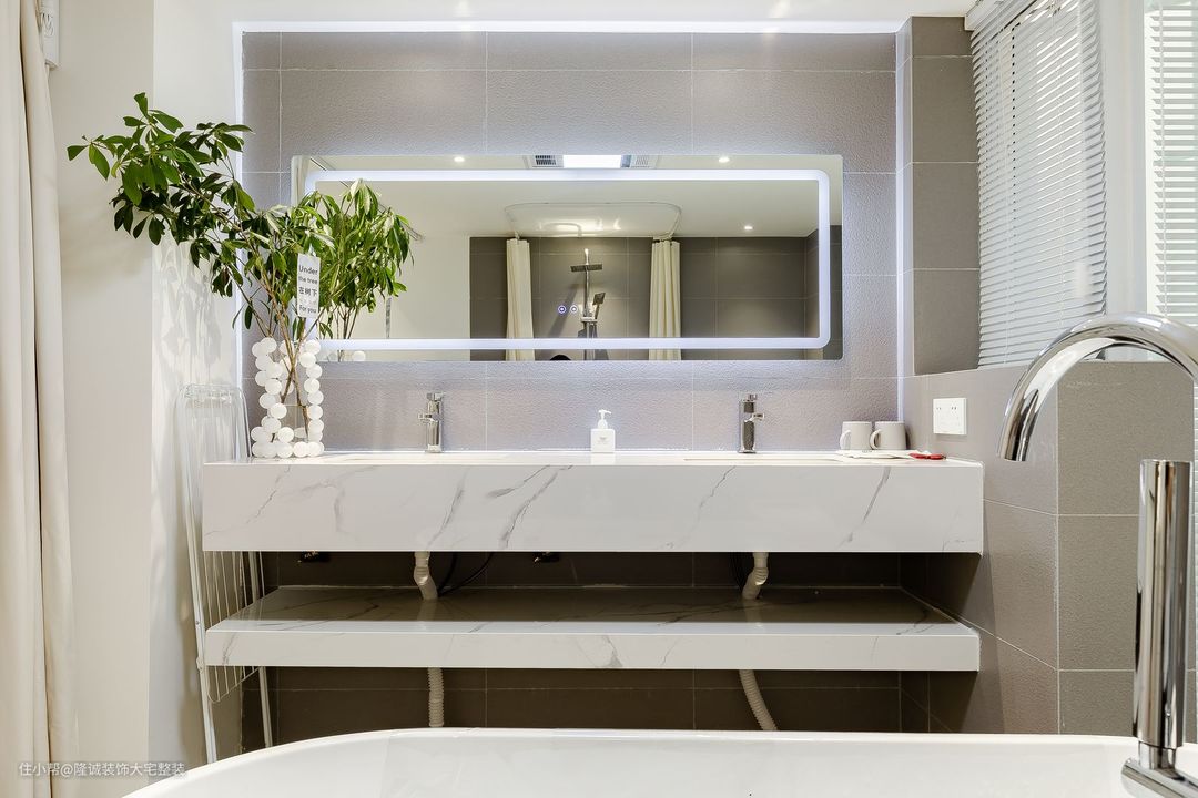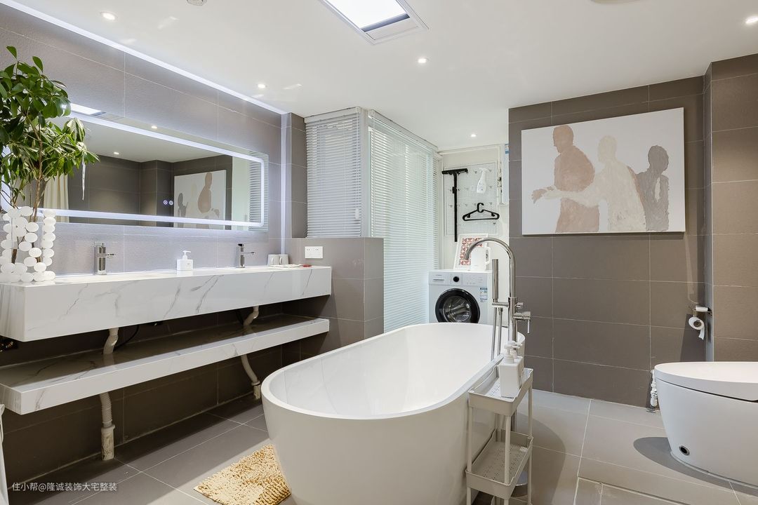 简洁大浴缸,双洗手台整体呈现出轻便、简静的视觉效果,同时干湿分离的布局设计,让洗浴动线流畅自如。