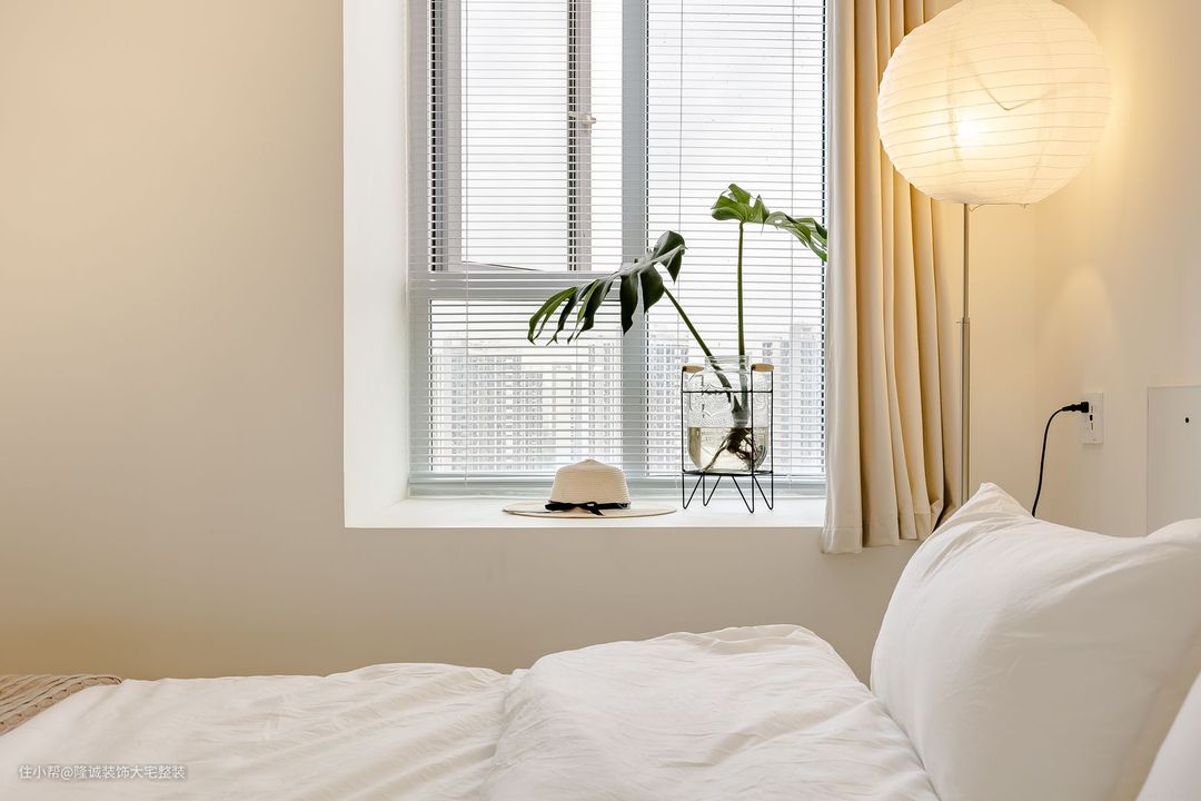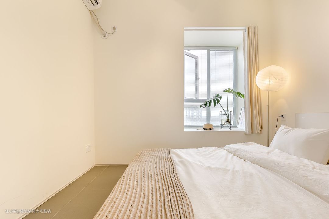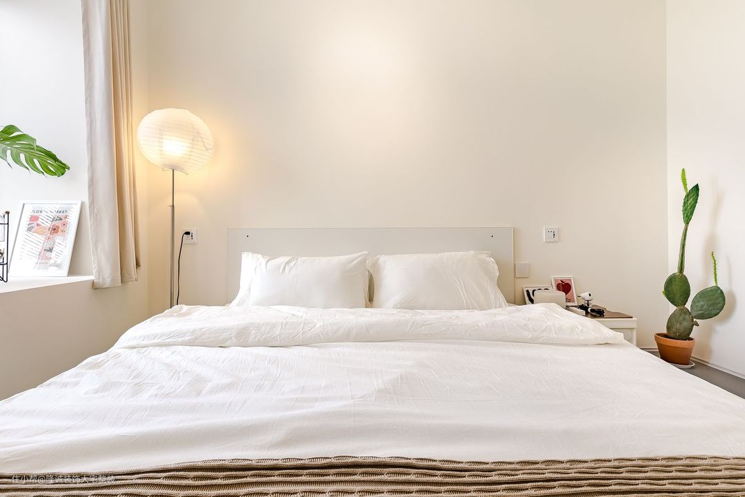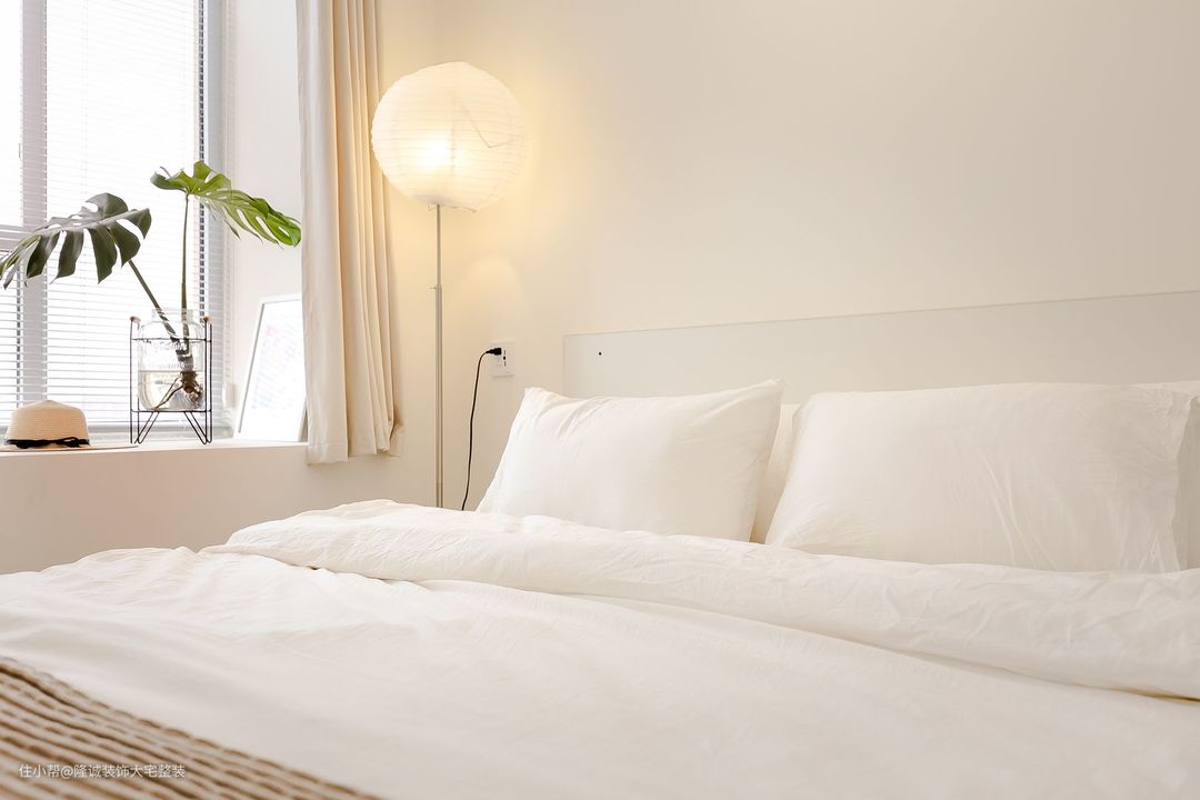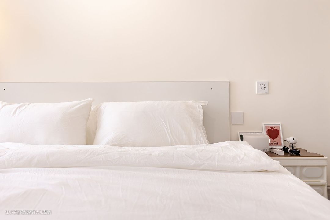 主卧室整体以柔和的白色色调为主。 床头上方悬挂的吊灯增添了大气感,半墙木饰面背景温馨自然,让空间更有层次感。
