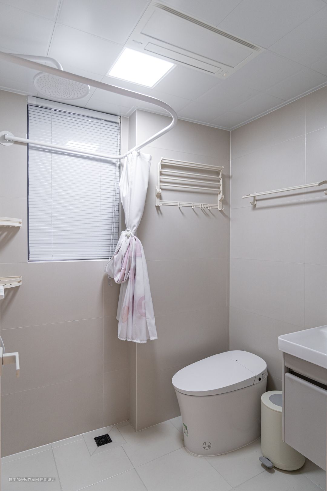 两个卫生间墙地面都通铺了奶咖色瓷砖,明亮温暖的颜色,弱化了线条的边界感,在无形中放大了空间视野。