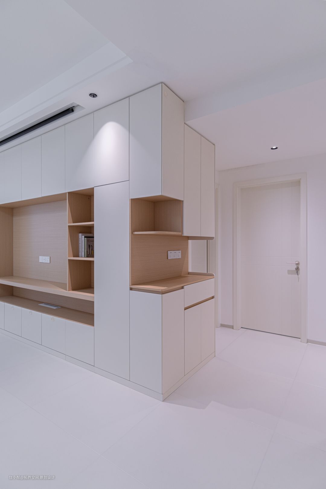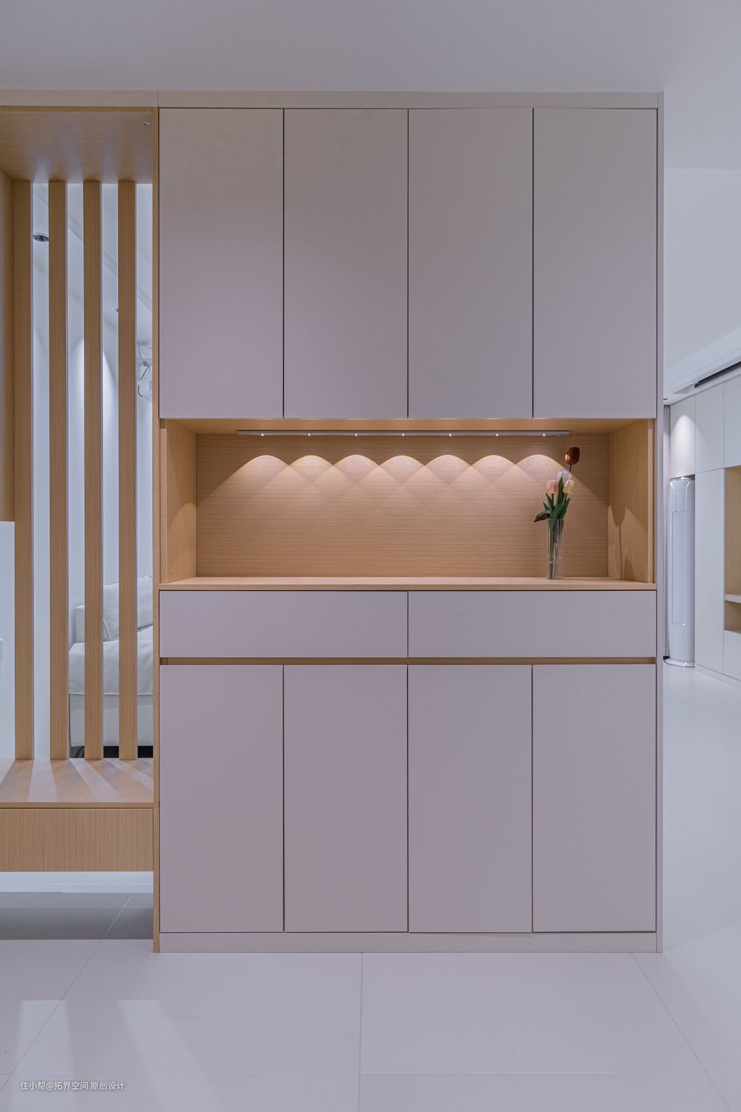 设计一个卡座+格栅背景板,方便出入换鞋,还营造了隔而不断的视觉效果,加上柜体的留空和灯带设计,显得异常通透随性。