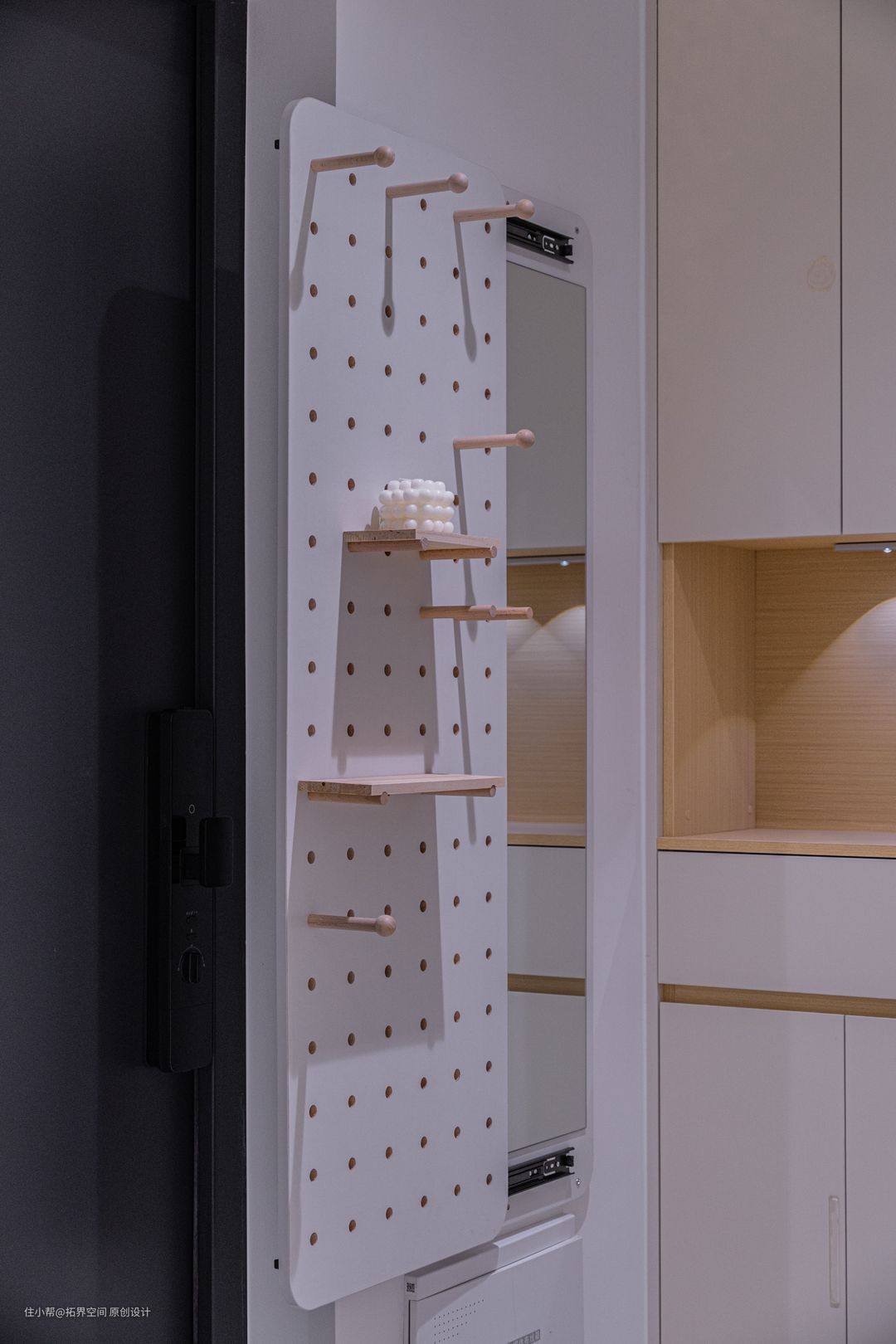 墙面上的洞洞板可别小瞧它,它身后还隐藏了一面全身镜,可谓是强强联合,提高了玄关的灵活性。