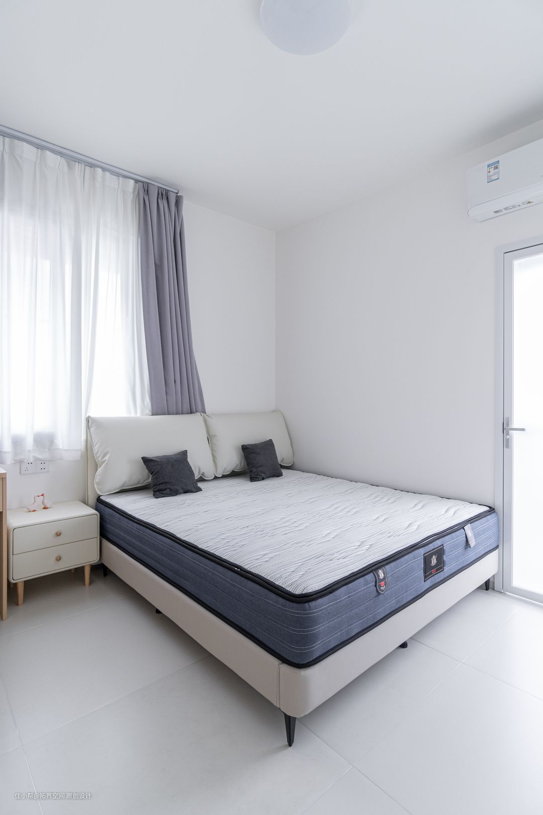 主卧延续了主体了风格设计,通白的墙面没有复杂的装饰,床头搭配一个精致小巧的床头柜,提供了一个简洁而不失温馨的睡眠环境。