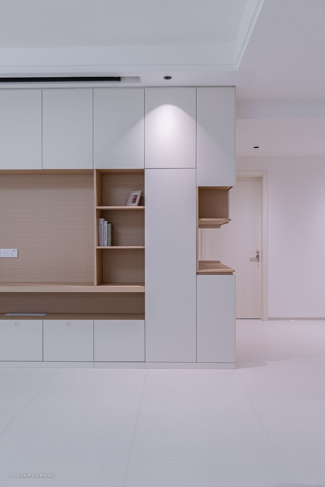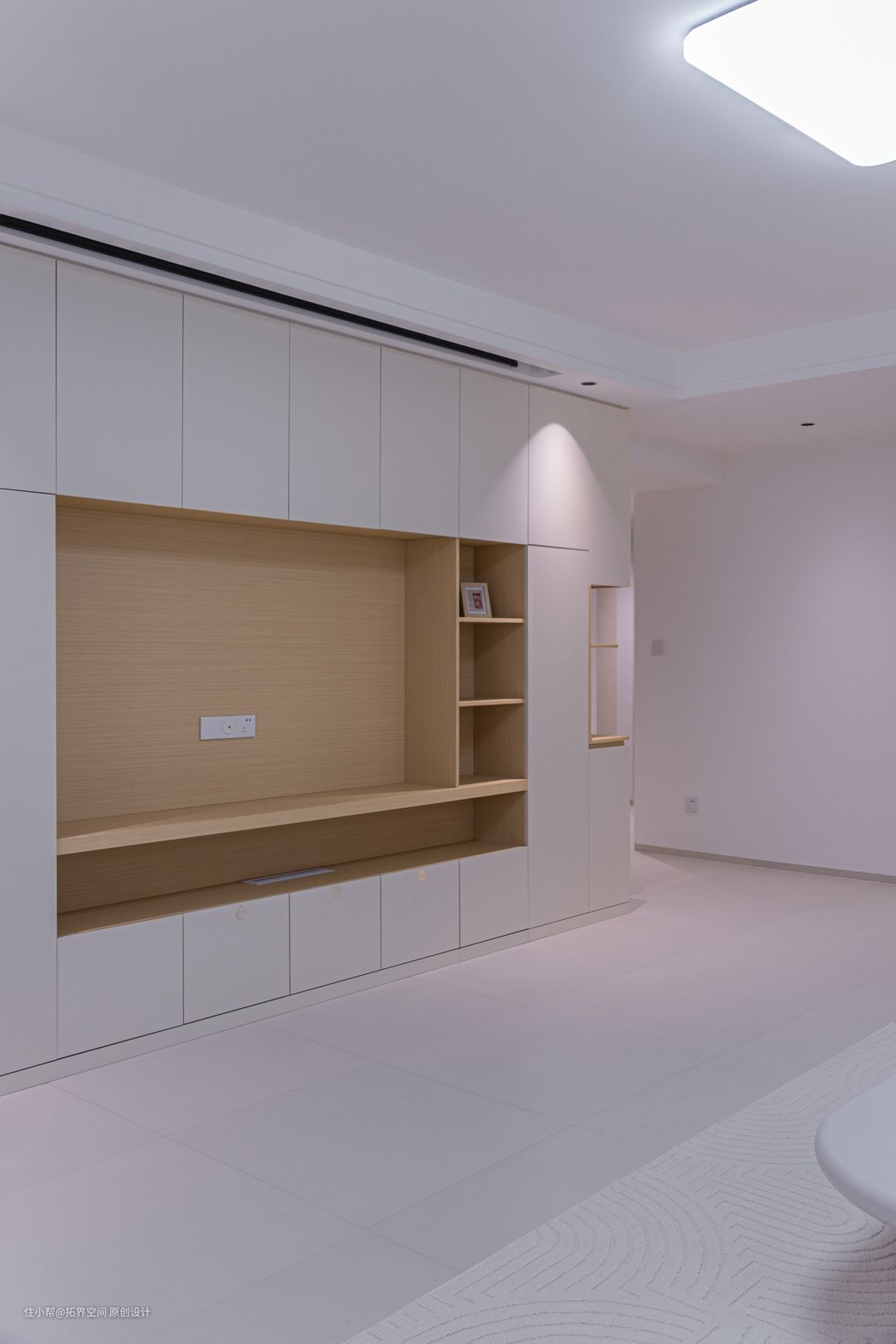 谁能想到玄关柜会给后面的客厅留出了置物架,可以放置一些摆件提升一下客厅颜值,原木色的加入,也为空间增添了层次感。