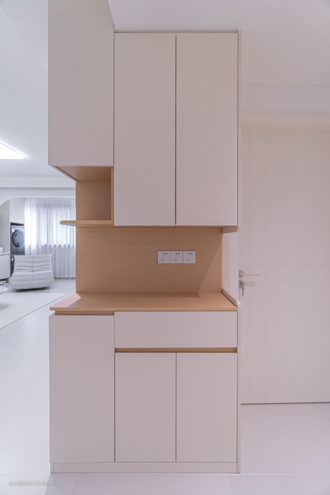 餐边柜表面是奶咖色,中间留空的部分加入了浅木色,优雅又温柔的氛围,很难让人不爱。