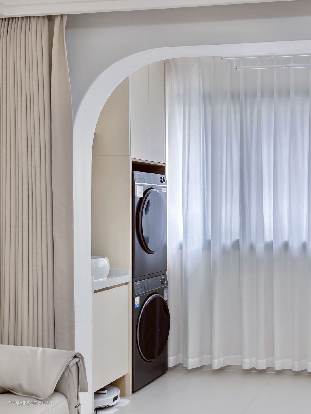 阳台两侧分别做了家政柜,一处是大型电器如洗衣机烘干机、扫地机器人的容身之处,一处是封闭式的柜体,可以放置乱七八糟的清洁工具和维修道具。