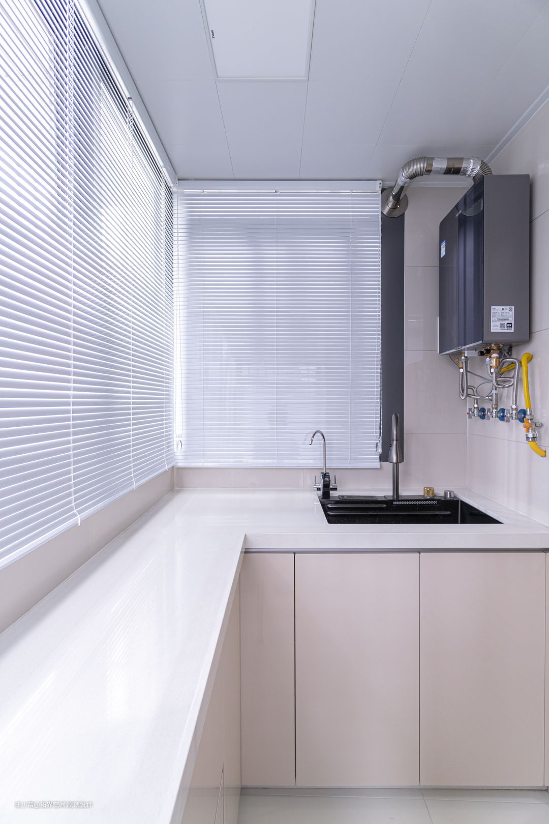 沿着转角延伸柜体,目的是为了最大限度地利用空间,从而提升储物功能,让家时刻保持整洁的状态,而高低错落也完美贴合了天花板的结构。