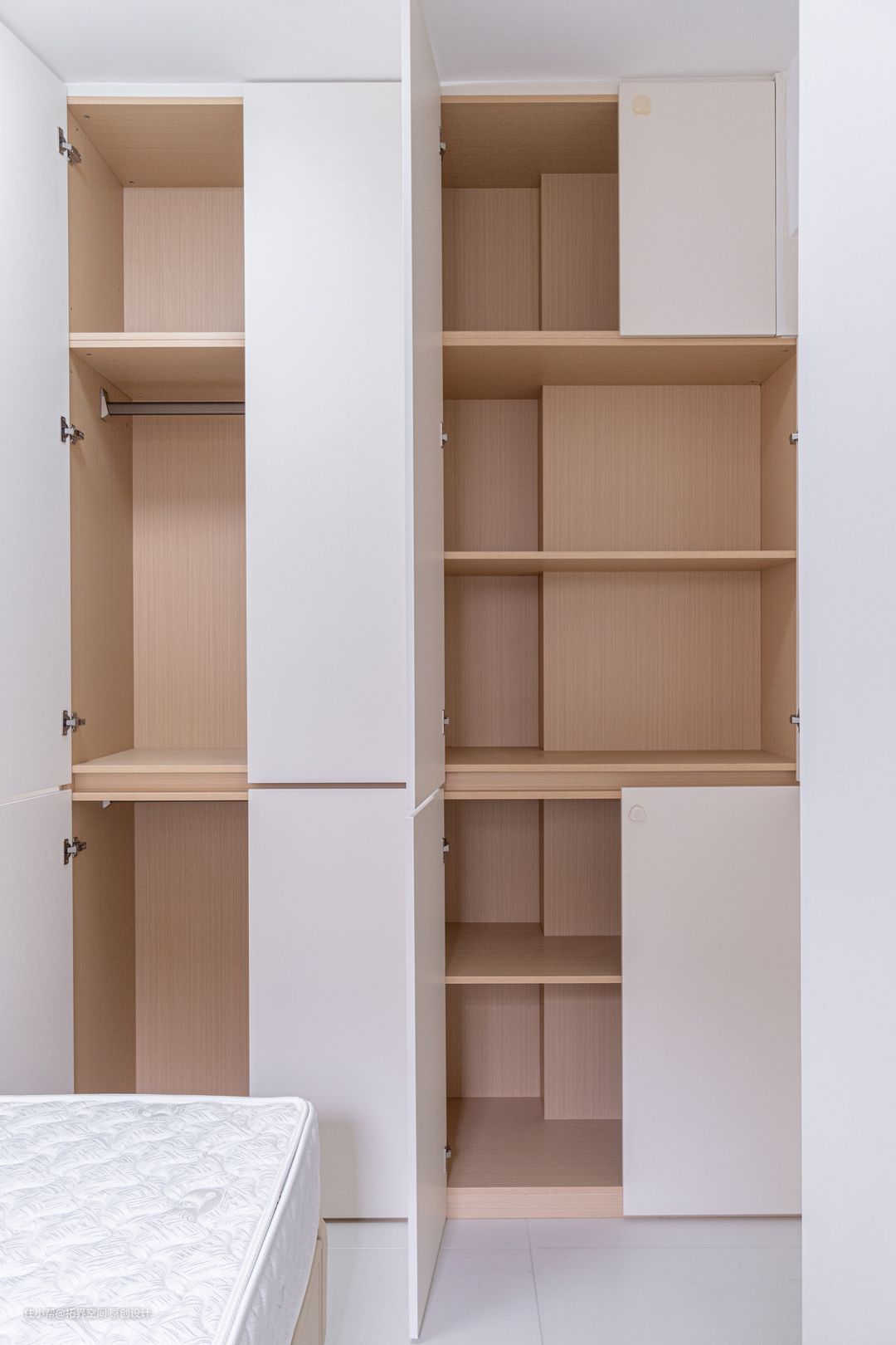 在床尾定制衣柜,床与衣柜之间刚好留足了过道空间,而内部空间采用不同大小的规格,错落有致,使衣物的收纳形式更加丰富。