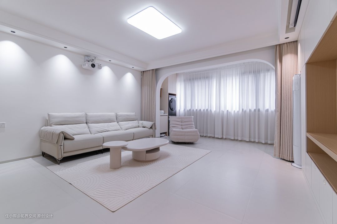 绕过玄关进入客厅,奶白色与奶咖色的搭配呈现出一种自然温馨的视觉效果,为空间增添雅致的氛围。