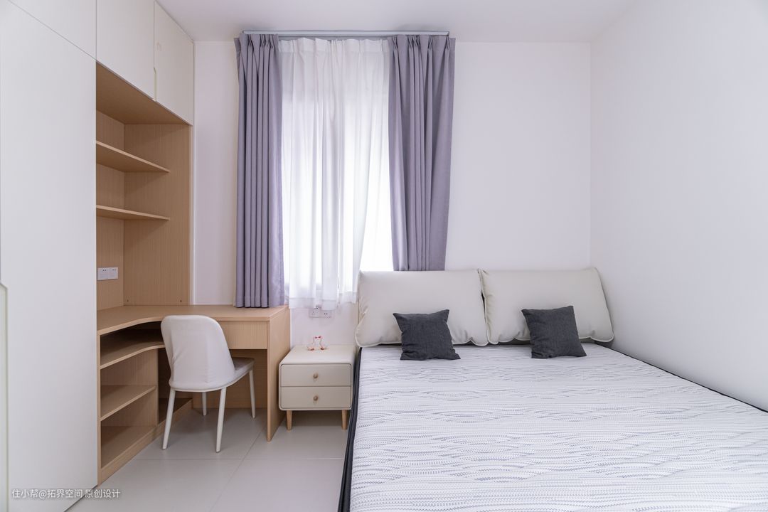 次卧暂时当作客房使用,因为空间较小,业主便选购了一张带抽屉的床具,可以解决次卧的储物空间不足的问题。