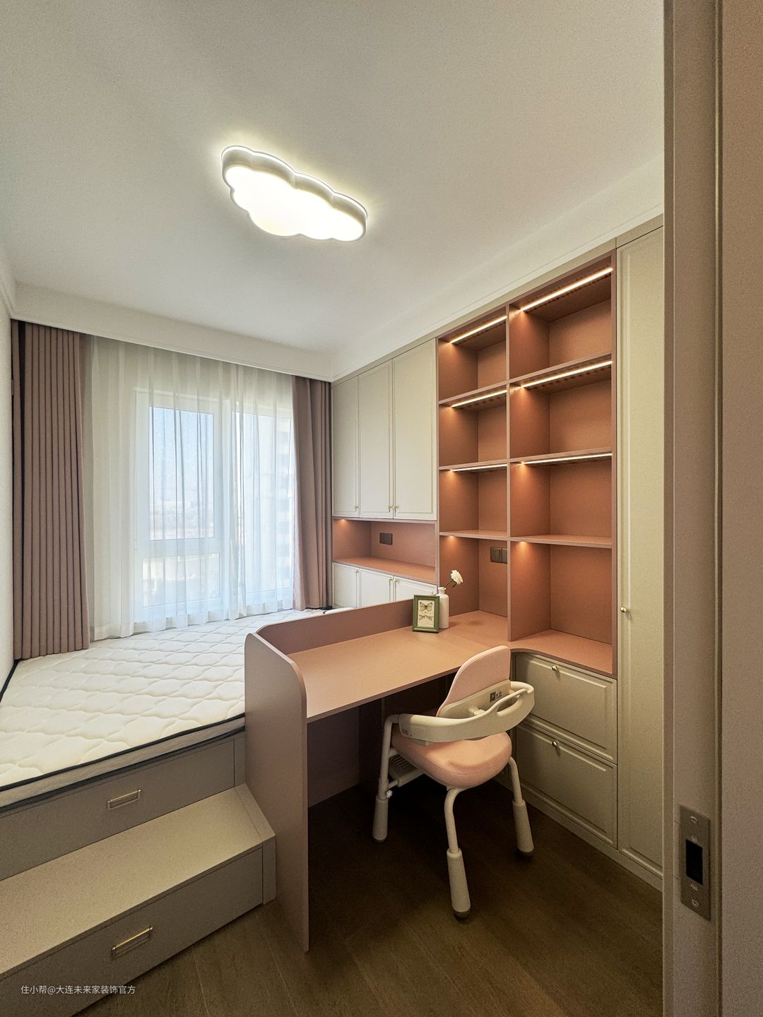 治愈的粉色系的全屋定制,衣柜到顶的设计,保证了收纳空间,又有童趣童真的感觉,榻榻米与书桌连接在一起,有限的空间无限的收纳。
