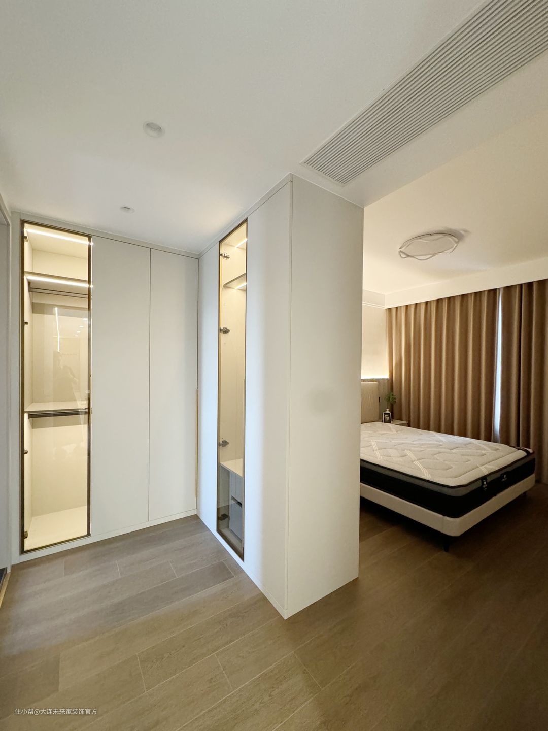 柜门极简风格,一门到顶的设计+无拉手,耐看又高级。虽然是放在卧室的衣帽间,但没有传统步入式衣帽间的空间封闭感,很好的将采光引入整个卧室,通透,高级,大气。