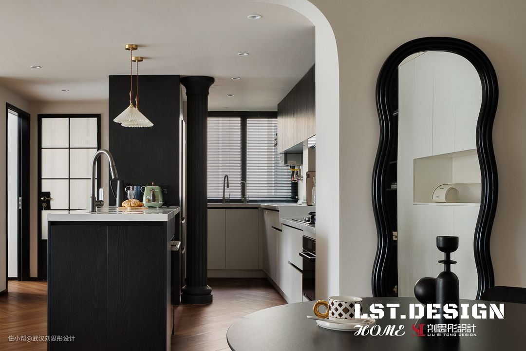 将原始厨房墙体拆除,打造完全开放的厨房,让原本窄小的视觉得以释放,开放式厨房与岛台构成u型布局,流畅的洗-切-炒动线缩短下厨时间,高低台设计更便于日常使用。