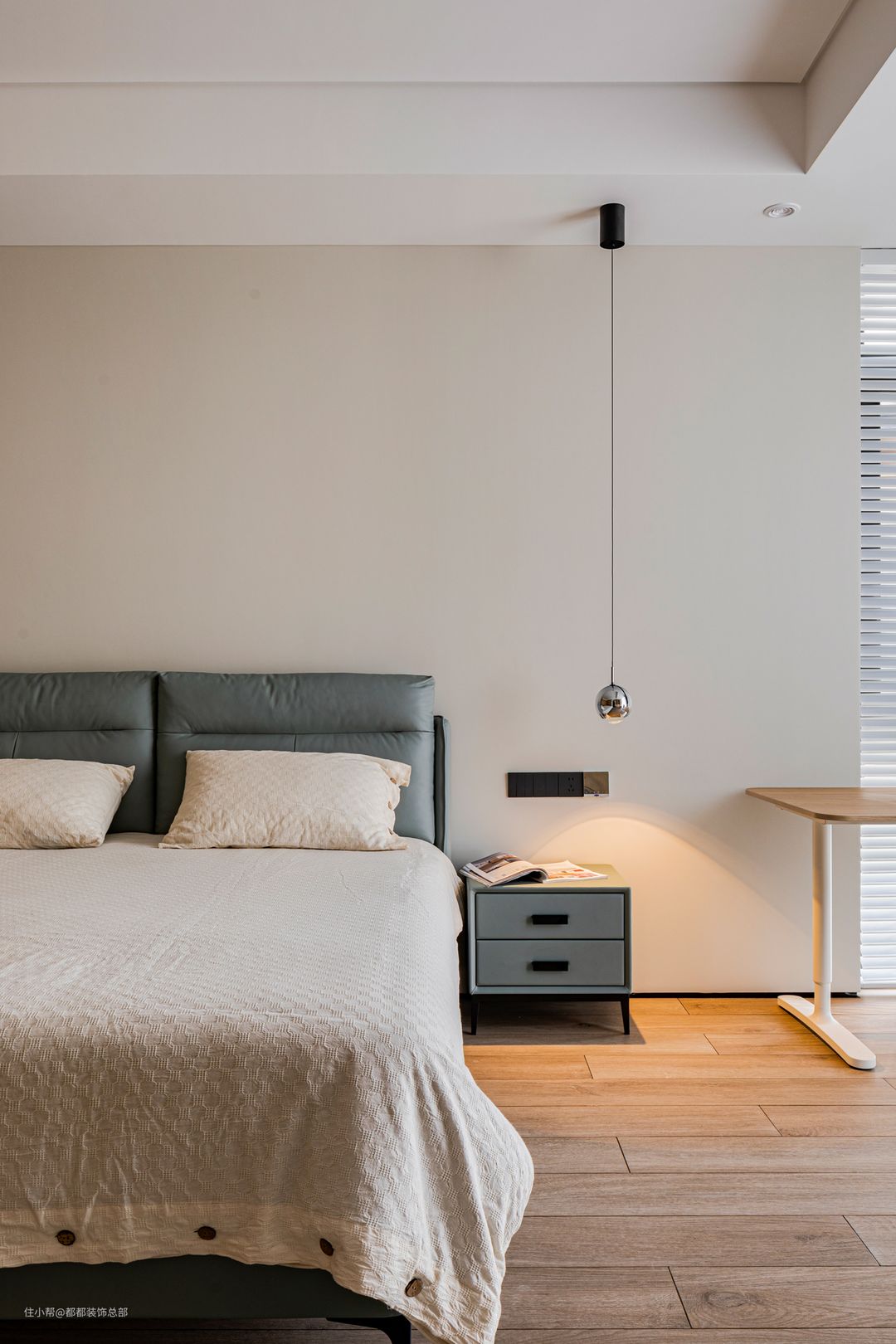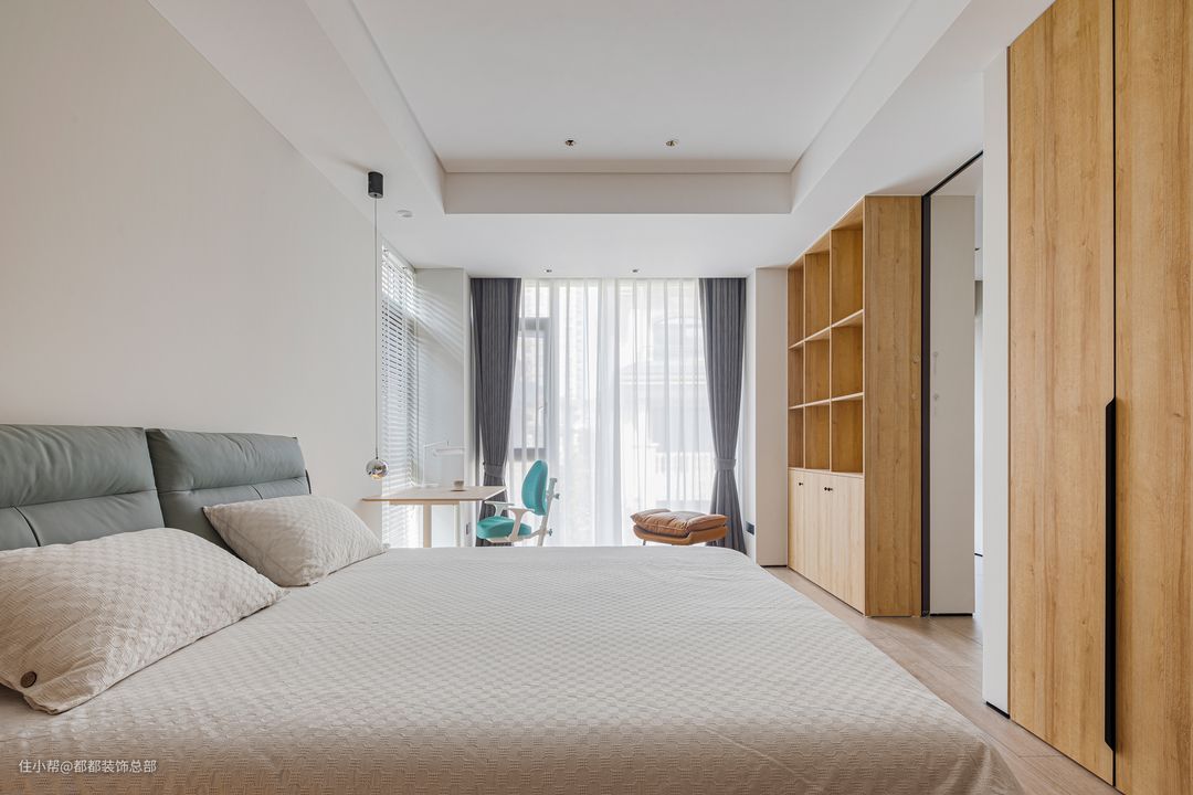 儿童房的设计与主卧理念相通,以简约、素雅为主,力图打造一个纯粹的个人休息空间。软包床头和暖白色床品营造出温馨舒适的休息氛围。 儿童房同时配备了书桌与可升降的人体工学椅,孩子的日常学习也可以在这里进行。除去必要配备的衣柜之外,还留出了一个单独的开放柜,孩子的书本、玩具可以统统放进去,一个专属于孩子的小书房就诞生啦~