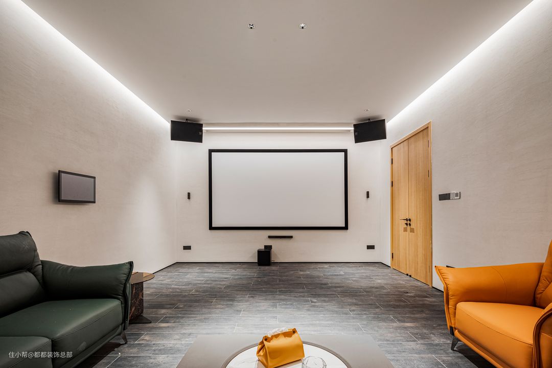 影音室以简约设计为主,采用大屏投影+双侧沉浸式音响,轻松get电影院氛围感。柔软的皮质沙发提供舒适的观影体验,闲暇时与家人围坐看一部经典老片,享受惬意舒适的假期时光。