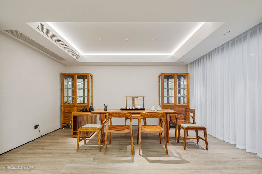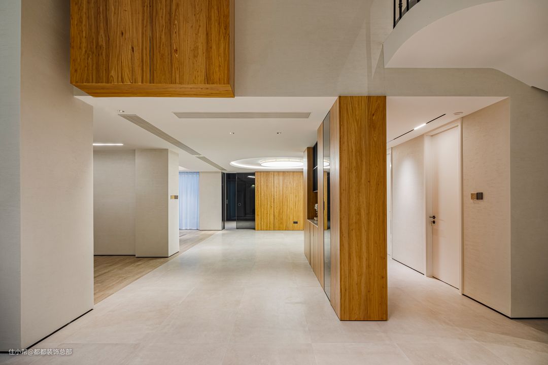 为了应对逢年过节的亲友聚餐,专门在负一楼设置宴会厅,圆形吊顶+圆形吸顶灯,宴会厅的轻奢氛围直接拉满。空间一侧设置原木色隐形收纳柜,餐具与用餐杂物轻松收纳其中。另一侧设置水吧台,佐餐饮品需求在这里得到满足。