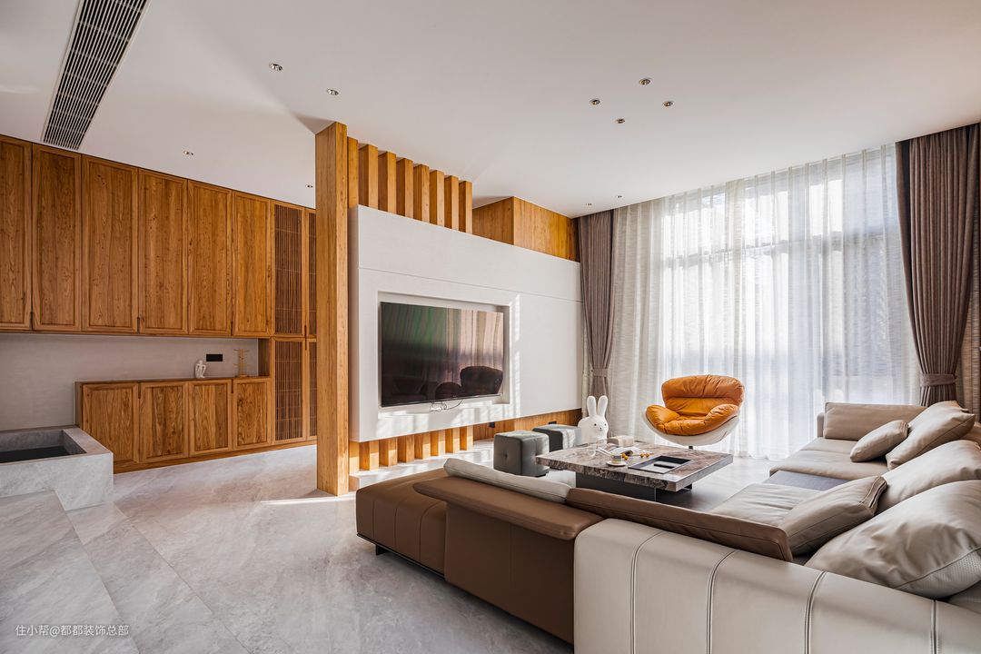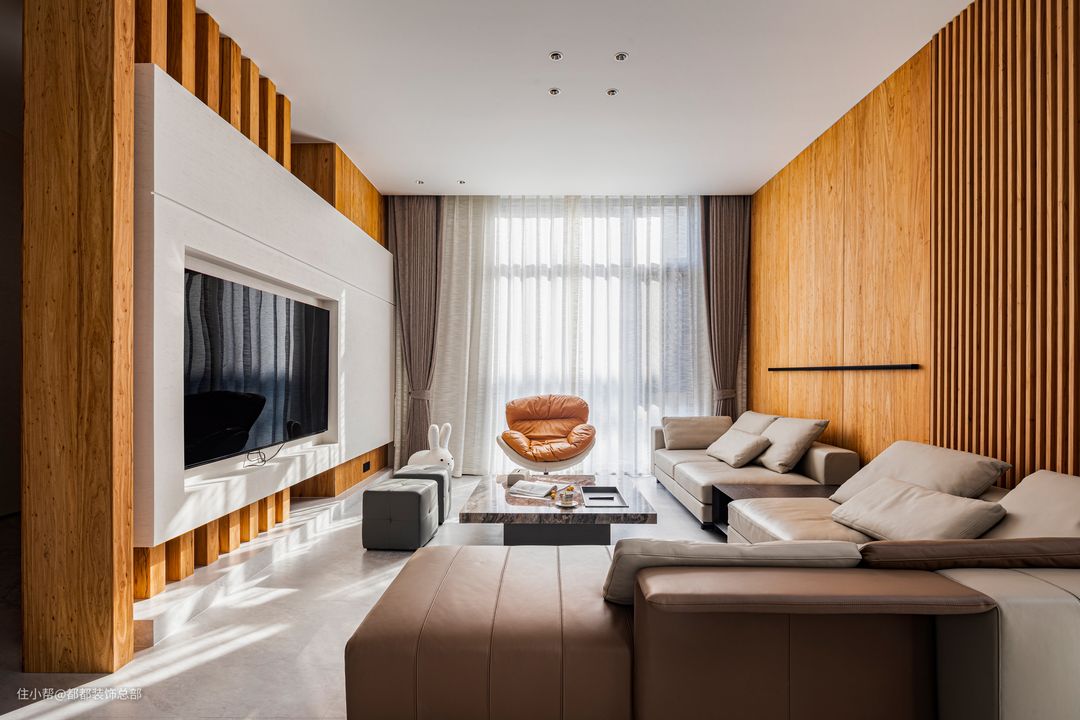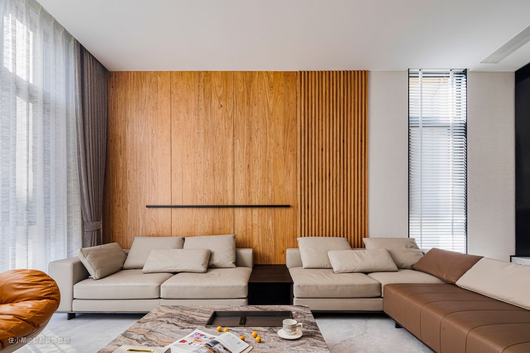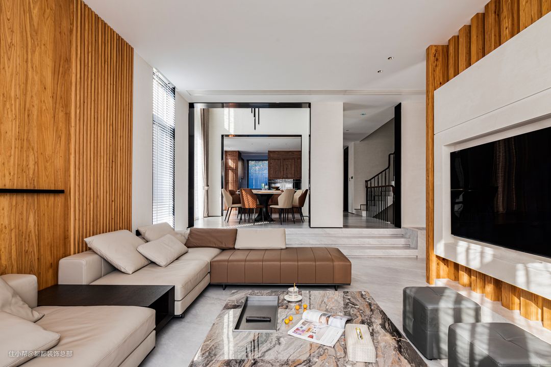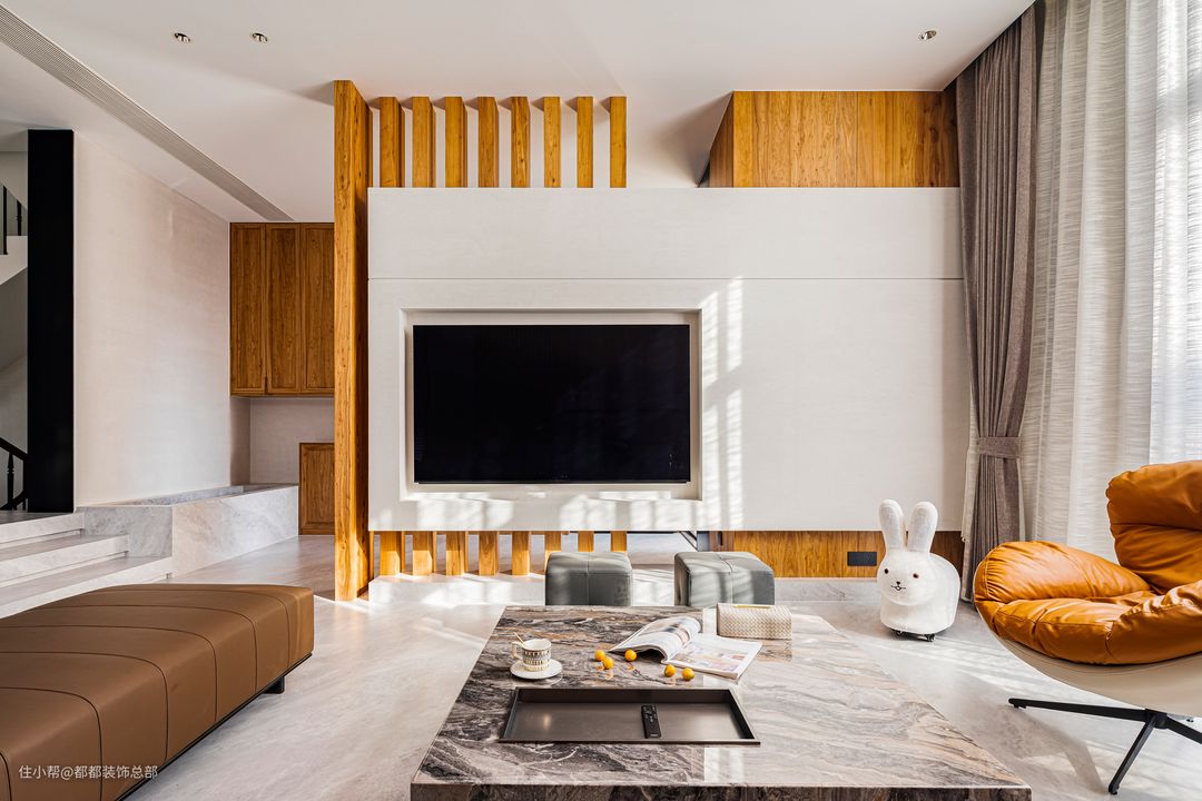 一进入客厅,就能感受到浓郁的自然气息。大量使用的原木色与白色调和谐共存,中古风与现代风在这里碰撞融合。置身客厅,仿佛能穿越时空,与数百年前的空间艺术展开一场酣畅淋漓的对话。 电视背景墙采用木制格栅与石材半墙的组合设计,深色木材与纯白色石材相得益彰,整体风格简约而清爽。茶几由整块大理石岩板制成,两种材质自然质朴,灵动之感与阳光碎片洒落交织,在客厅内静静流淌,营造出宁静优雅的氛围。 组合式沙发围合出一个温馨的客厅空间,凝聚了整个家庭的和谐氛围。宽敞的沙发足以容纳众多客人,沙发背景墙由原木护墙板和格栅设计组成,配以黑色线条灯,提升了整体氛围感,避免单调乏味,同时保留了简约的质感。