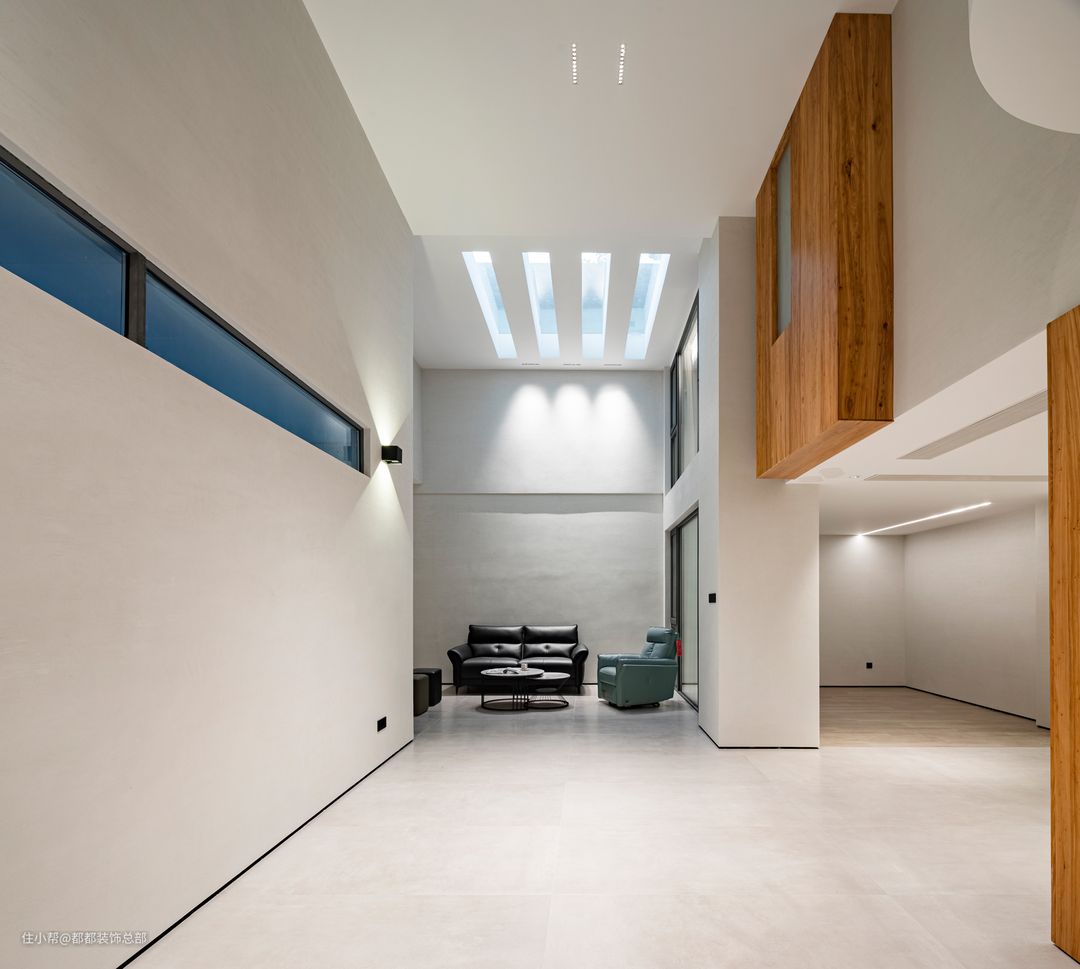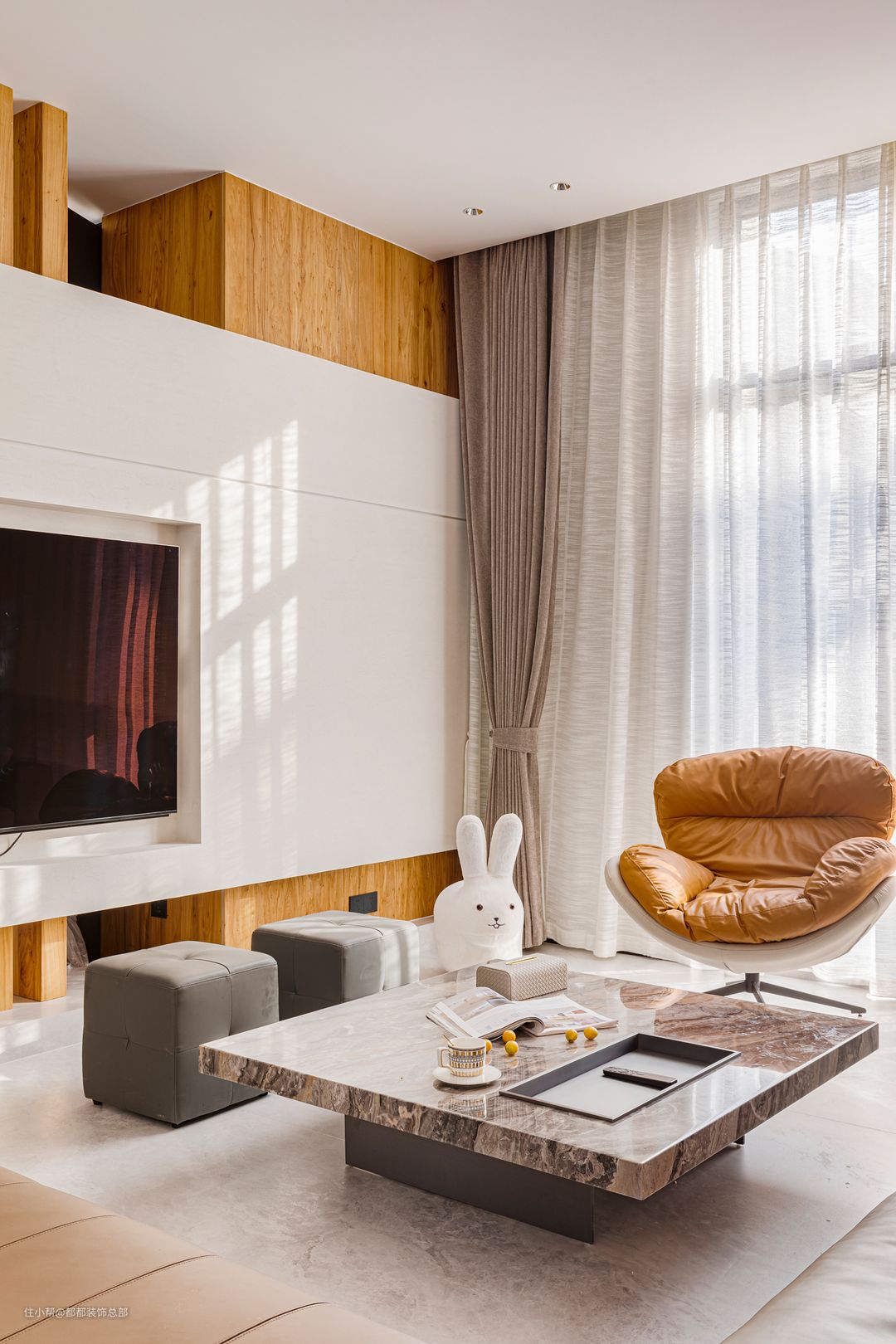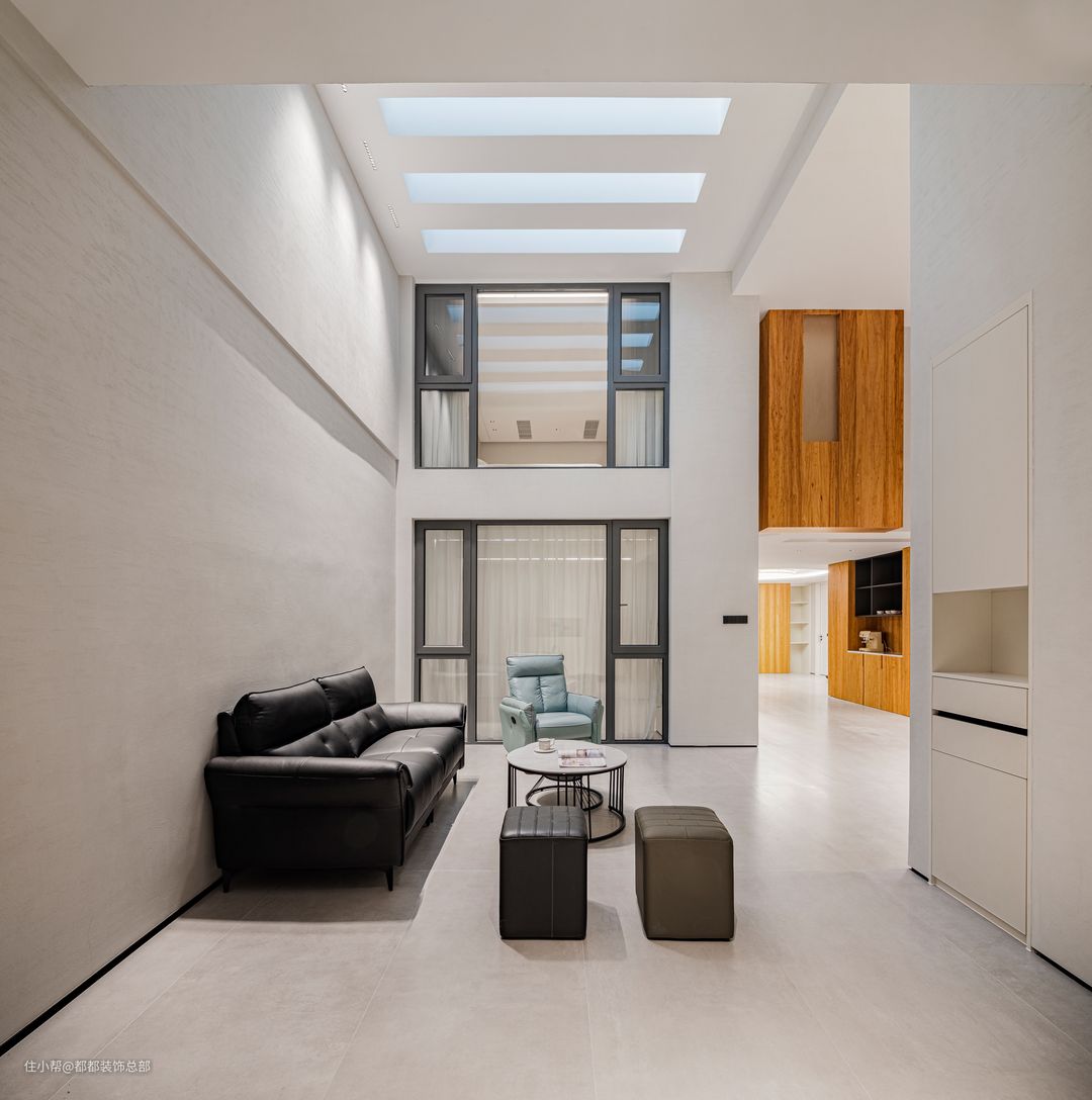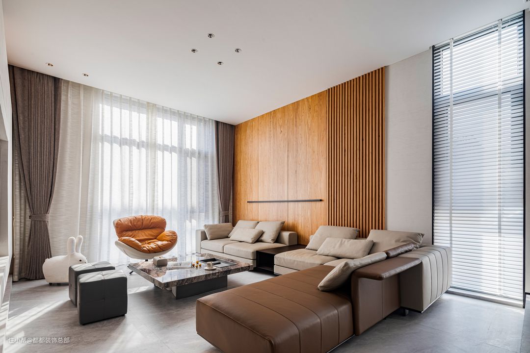一进入客厅,就能感受到浓郁的自然气息。大量使用的原木色与白色调和谐共存,中古风与现代风在这里碰撞融合。置身客厅,仿佛能穿越时空,与数百年前的空间艺术展开一场酣畅淋漓的对话。 电视背景墙采用木制格栅与石材半墙的组合设计,深色木材与纯白色石材相得益彰,整体风格简约而清爽。茶几由整块大理石岩板制成,两种材质自然质朴,灵动之感与阳光碎片洒落交织,在客厅内静静流淌,营造出宁静优雅的氛围。 组合式沙发围合出一个温馨的客厅空间,凝聚了整个家庭的和谐氛围。宽敞的沙发足以容纳众多客人,沙发背景墙由原木护墙板和格栅设计组成,配以黑色线条灯,提升了整体氛围感,避免单调乏味,同时保留了简约的质感。