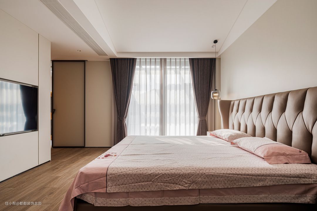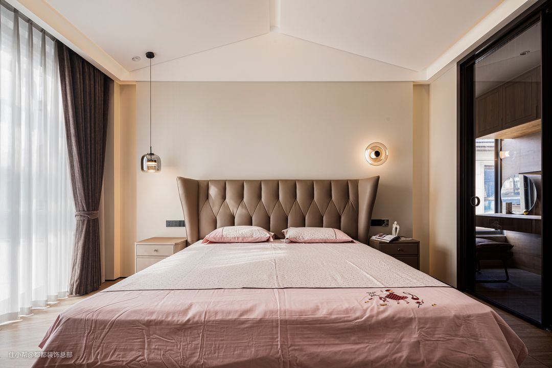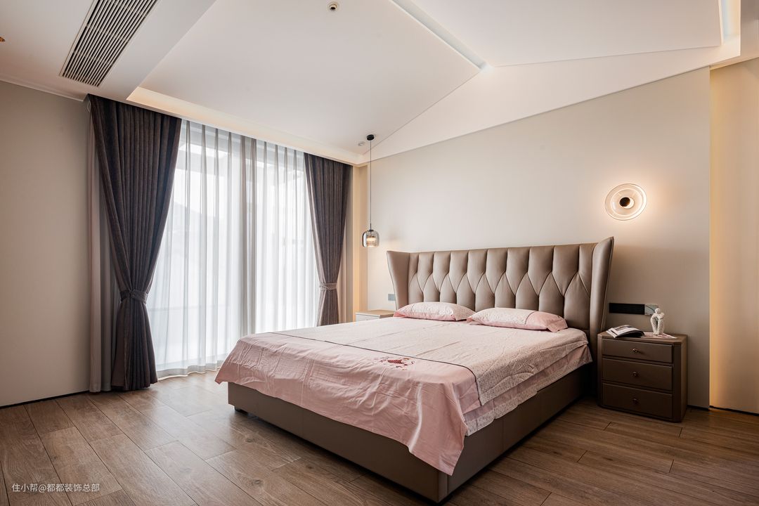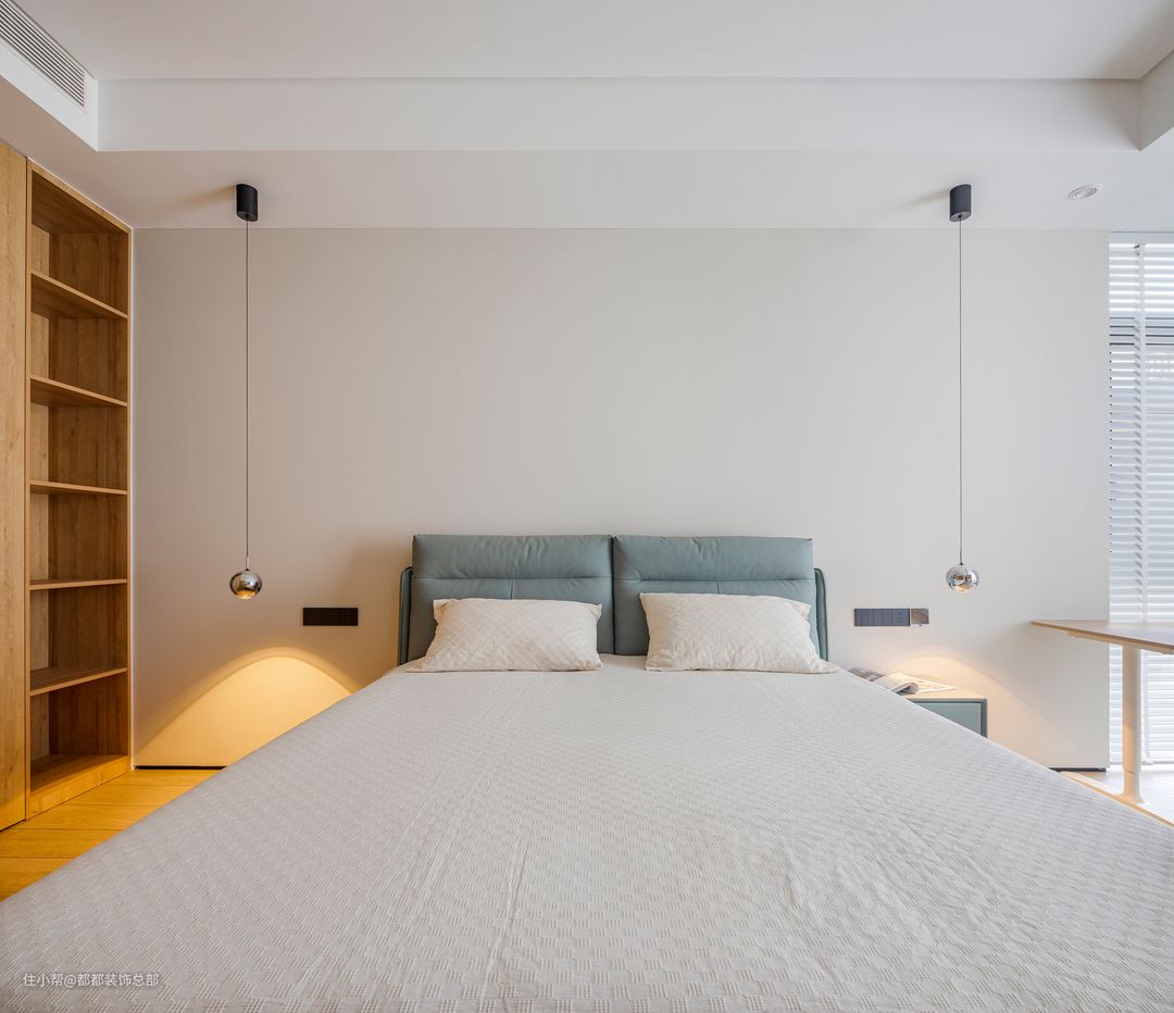 主卧的设计以素雅的暖色调为主,素色墙面配合暖黄色灯光,营造出温馨宜人的安睡氛围。棕色皮质床头彰显质感,藕荷色床品上点缀着精致的绣花,为卧室增添了雅致而静谧的气息,使人可以卸下一天的疲惫,享受独属于自己的宁静空间。 两侧的床头柜选用了与床同色的棕色,整体显得更加统一和谐。小抽屉增加了收纳空间,可以存放眼罩、耳塞等睡眠用品,保持床面的整洁干净。床头灯采用不对称设计,为整个空间注入了一丝灵动与趣味。 卧室的另一侧是一个步入式衣帽间,延续了客厅的原木中古风。整墙的木质衣柜提供了超大的储物空间,足以容纳四季的衣物。洗手台与衣柜在同一个空间内,早晨洗漱后转身即可挑选当天的衣物和配饰,动线流畅,节省时间。