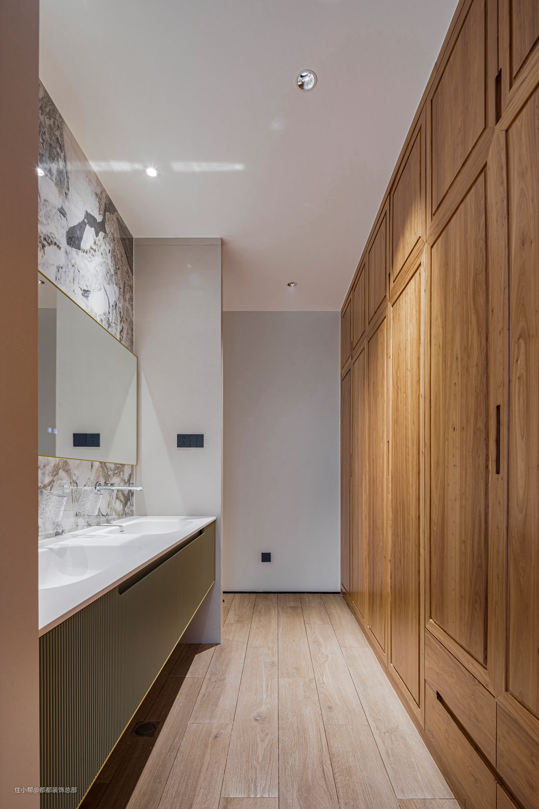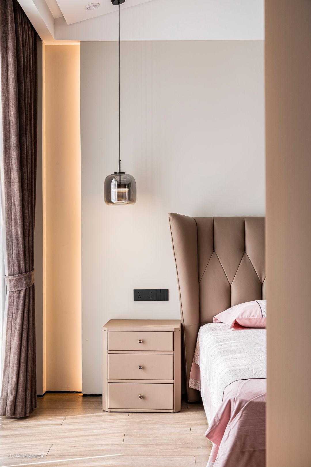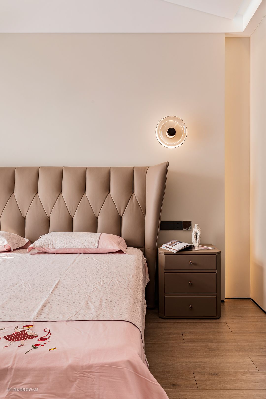 主卧的设计以素雅的暖色调为主,素色墙面配合暖黄色灯光,营造出温馨宜人的安睡氛围。棕色皮质床头彰显质感,藕荷色床品上点缀着精致的绣花,为卧室增添了雅致而静谧的气息,使人可以卸下一天的疲惫,享受独属于自己的宁静空间。 两侧的床头柜选用了与床同色的棕色,整体显得更加统一和谐。小抽屉增加了收纳空间,可以存放眼罩、耳塞等睡眠用品,保持床面的整洁干净。床头灯采用不对称设计,为整个空间注入了一丝灵动与趣味。 卧室的另一侧是一个步入式衣帽间,延续了客厅的原木中古风。整墙的木质衣柜提供了超大的储物空间,足以容纳四季的衣物。洗手台与衣柜在同一个空间内,早晨洗漱后转身即可挑选当天的衣物和配饰,动线流畅,节省时间。
