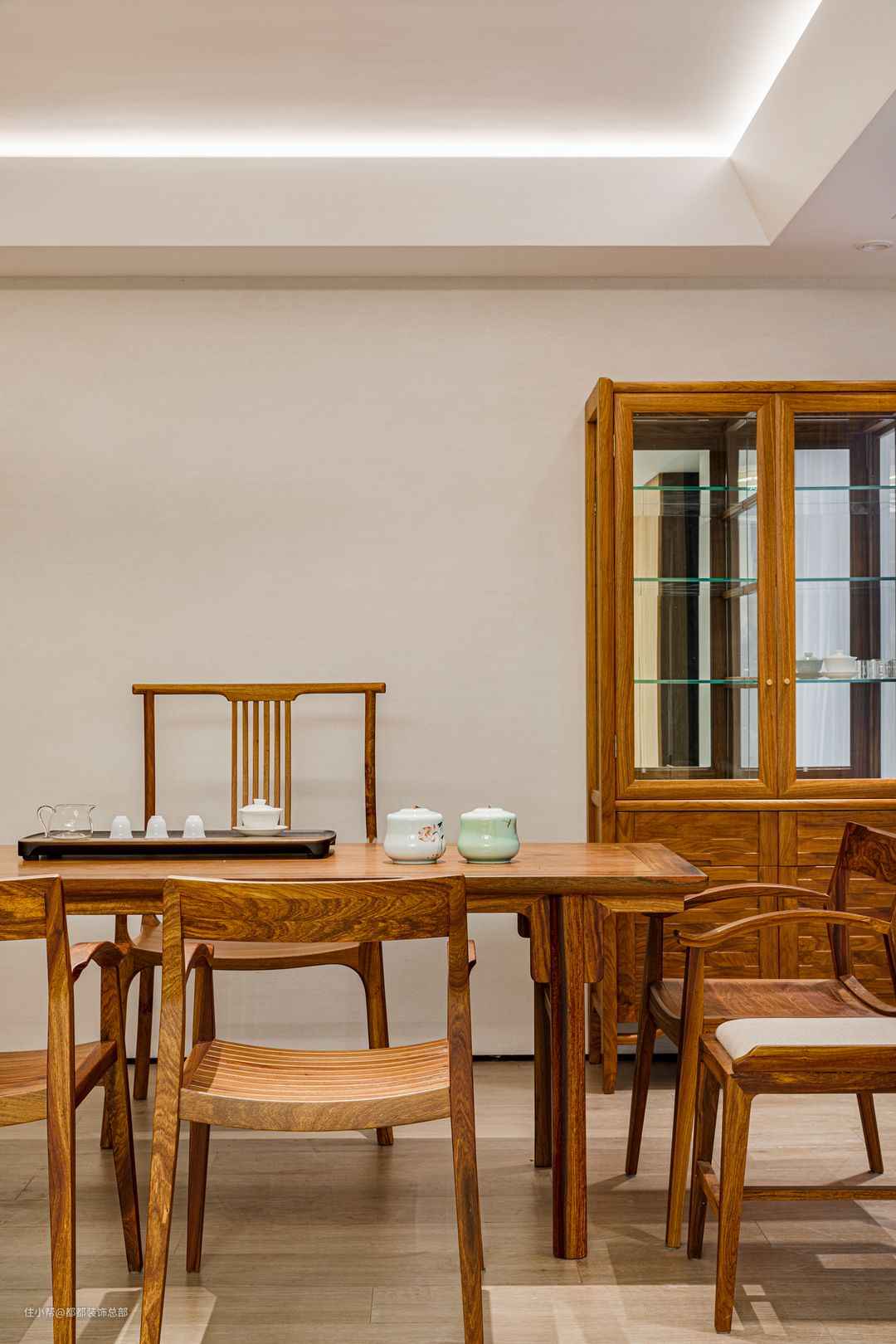 中国人喝茶非常看重环境,一间古色古香的茶室不仅是品茗好地方,更是冶炼心境的好去处。张先生的茶室几乎全部使用原木,质朴的木色茶桌与温润的陶瓷茶具互相浸染,在茶香与茶色中探寻雅致情趣。茶桌两侧设置封闭式柜子,陈列展示茶具藏品。