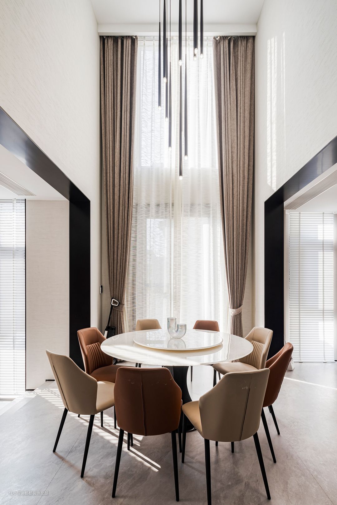 从客厅拾级二三就能步入餐厅空间,户型中自带的垭口对客餐厅、厨房空间做出软隔断,保留浑然一体的空间特质又分区明确。挑高的餐厅用巨型流苏灯为用餐氛围增添了几分轻奢浪漫感。 圆形白玻转盘餐桌搭配皮质餐椅,精致的用餐氛围直接拿捏。一家人围坐一起,开瓶醇厚的红酒,摆脱一天的疲累,享受温馨的晚餐,普通的一刻也能成为隽永的记忆。