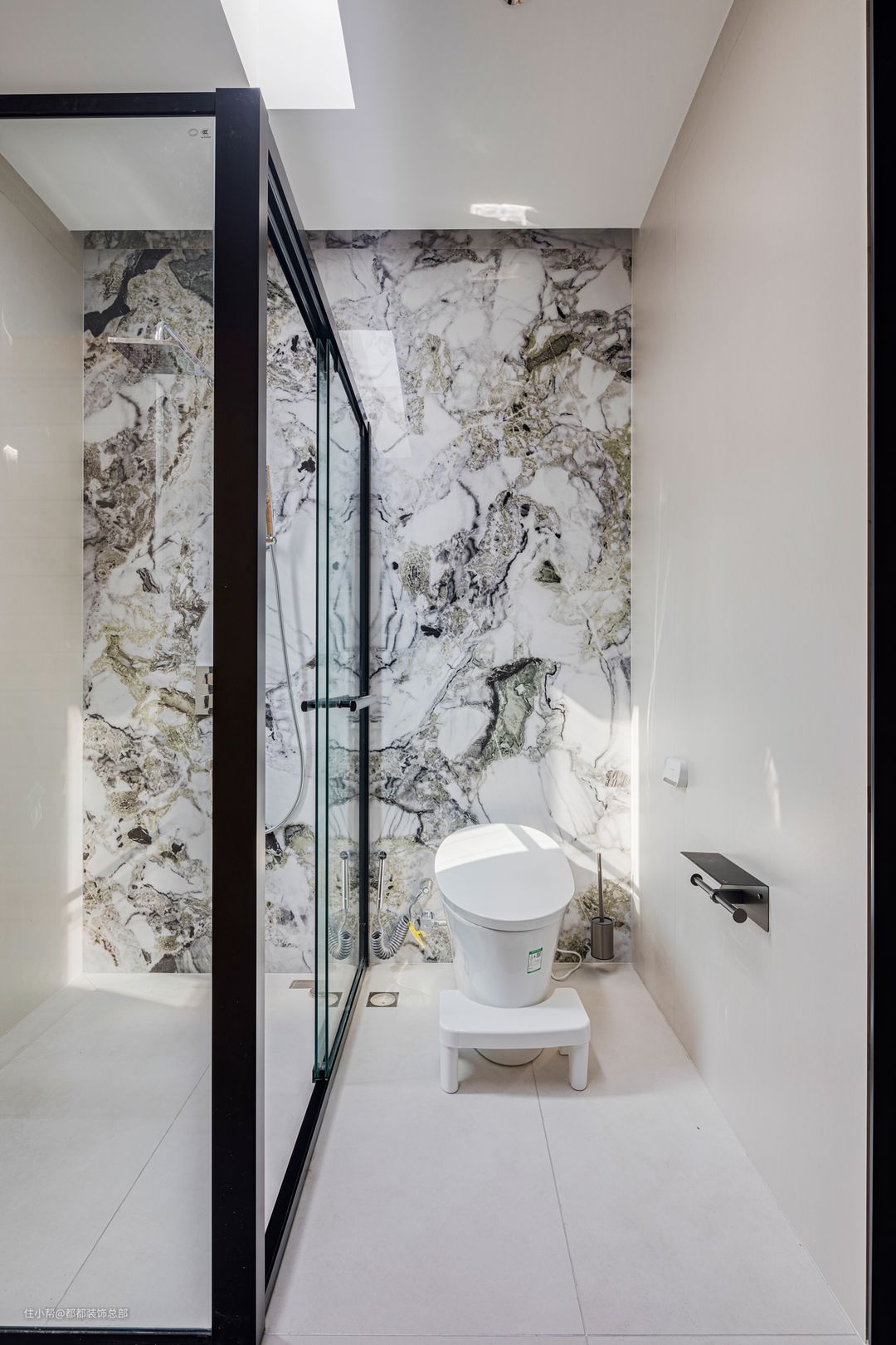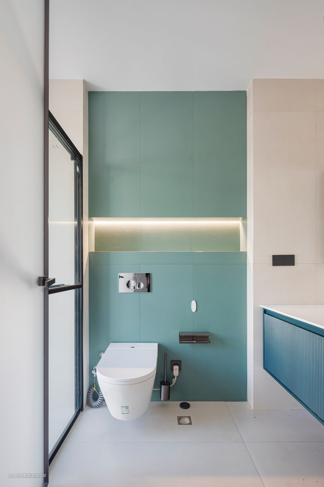 客卫也是以简约实用为主,增加壁龛和储物柜,卫生间消耗品都可以放进去不显凌乱。白色与蓝色系的组合拉满浴室的清爽感,黑色窄框浴室门增加精致感。