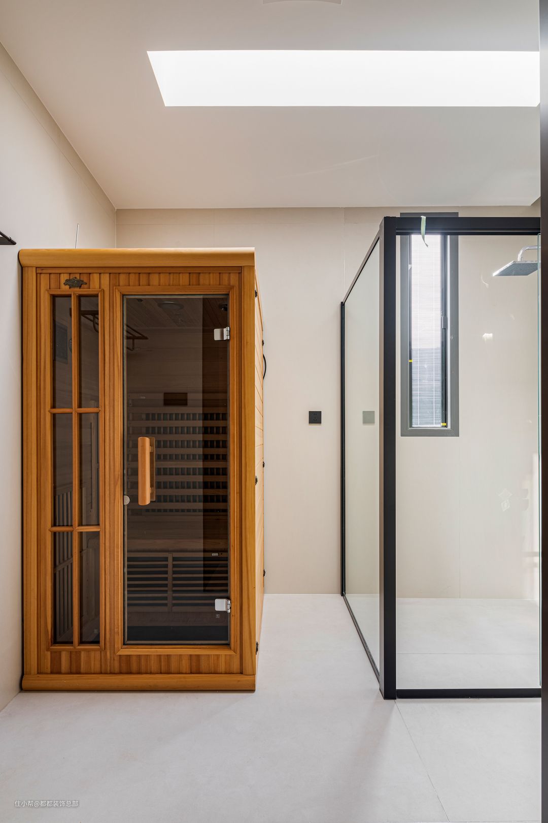 主卫洗手台外移,做了干湿分离,清理卫生更加方便。在颜色上依旧保持白色为主色调,大理石板自然灵动的花纹缓解单调。主卫还设置了一个小型汗蒸房,洗完澡后在汗蒸房里护肤放松,满满的都是惬意。