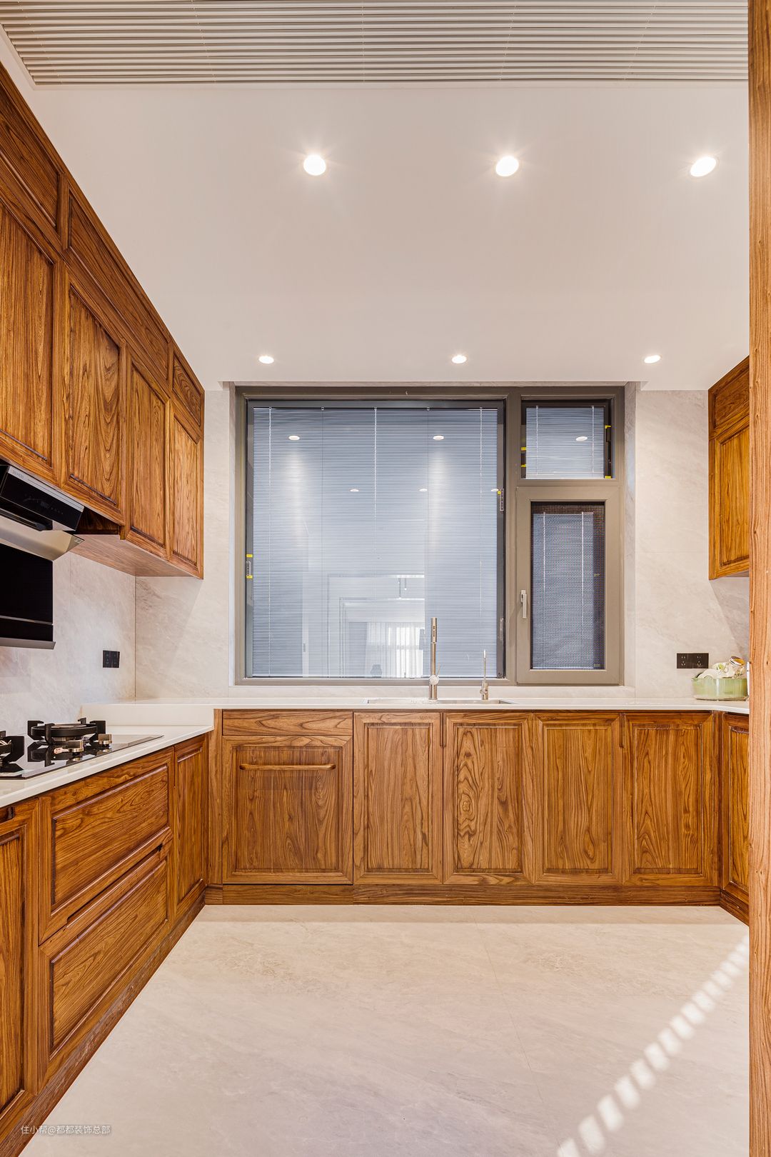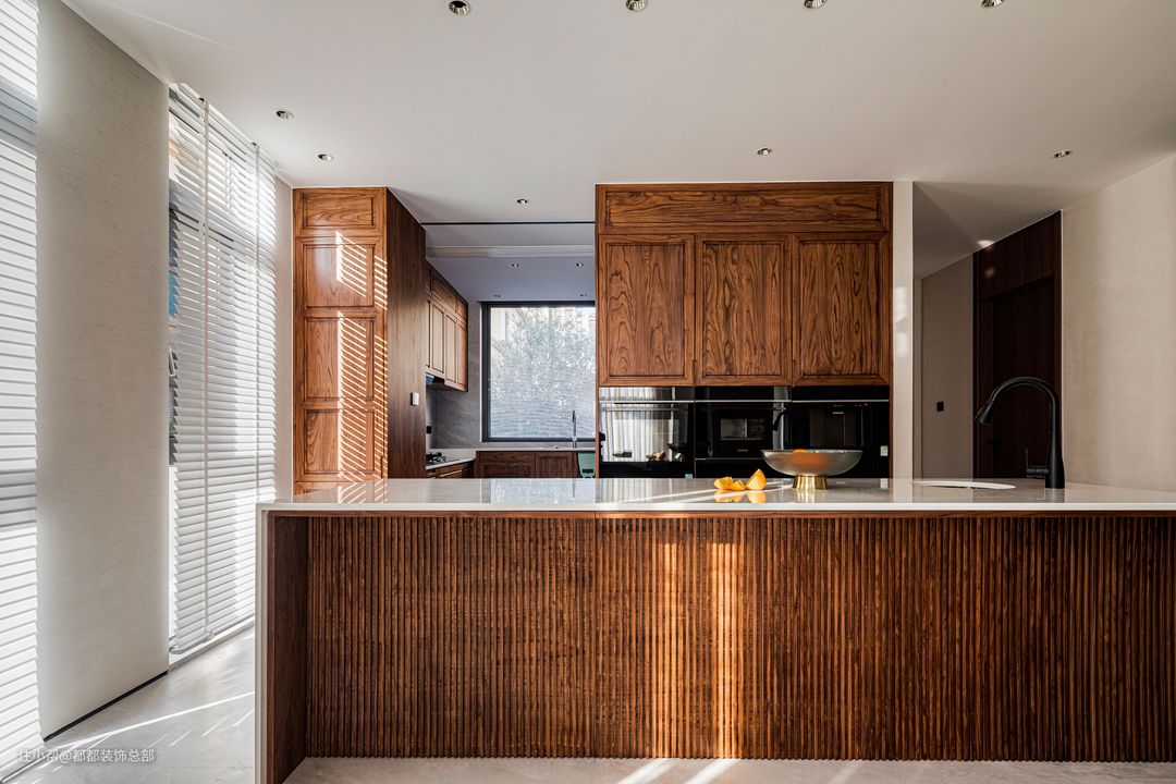 厨房是中西厨结合,外部与餐厅连接处设置岛台,引出台盆和水龙头,在这里简单拌个沙拉切个水果超方便,嵌入式蒸烤箱美观又不占空间,西式蛋糕和小甜点也能手到擒来。 再往里走是传统的中式厨房,U型布局形成一个完整的洄游动线,水槽台面和灶台设计高低差,厨房整体完全按照人体工学进行设计,致力于打造一个舒适温馨的厨房氛围。