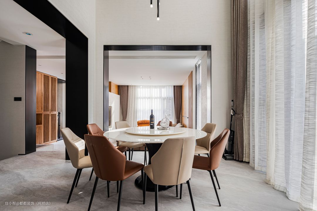 从客厅拾级二三就能步入餐厅空间,户型中自带的垭口对客餐厅、厨房空间做出软隔断,保留浑然一体的空间特质又分区明确。挑高的餐厅用巨型流苏灯为用餐氛围增添了几分轻奢浪漫感。 圆形白玻转盘餐桌搭配皮质餐椅,精致的用餐氛围直接拿捏。一家人围坐一起,开瓶醇厚的红酒,摆脱一天的疲累,享受温馨的晚餐,普通的一刻也能成为隽永的记忆。