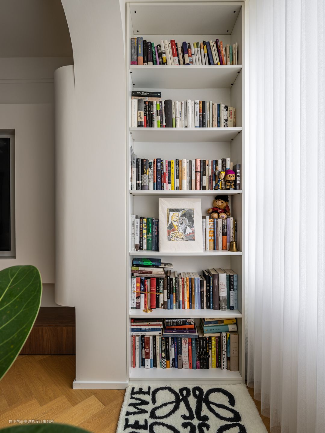 阳台处的开放式书柜为该区域打造阅读空间,闲暇时光下,增添更多娱乐消遣的可能性。