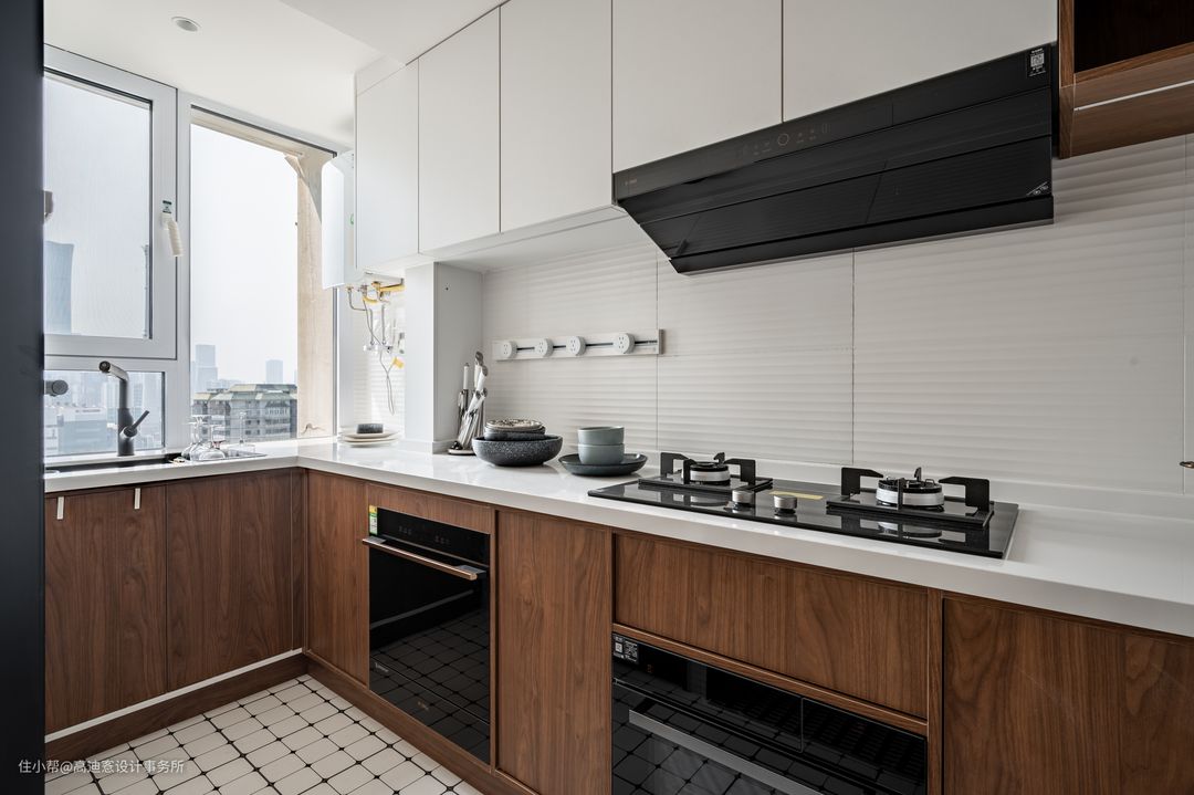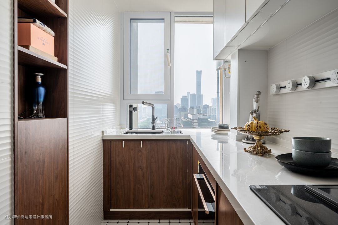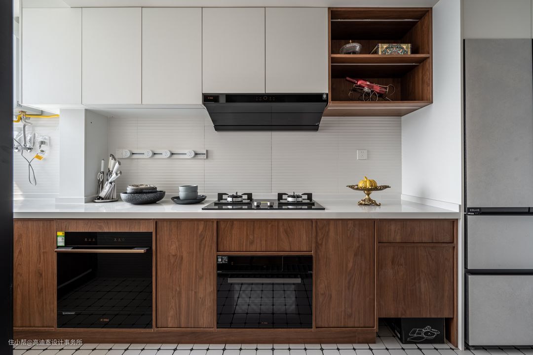 ■ 开放式厨房结合L型操作区更为实用,洗切炒动线十分流畅,内嵌厨电丰富厨房功能。 ■ 白色吊柜+木质地柜满足空间收纳,上浅下深更具视觉层次。 ■ 地柜的骨骼线凸显出立体细节,散发复古质感。