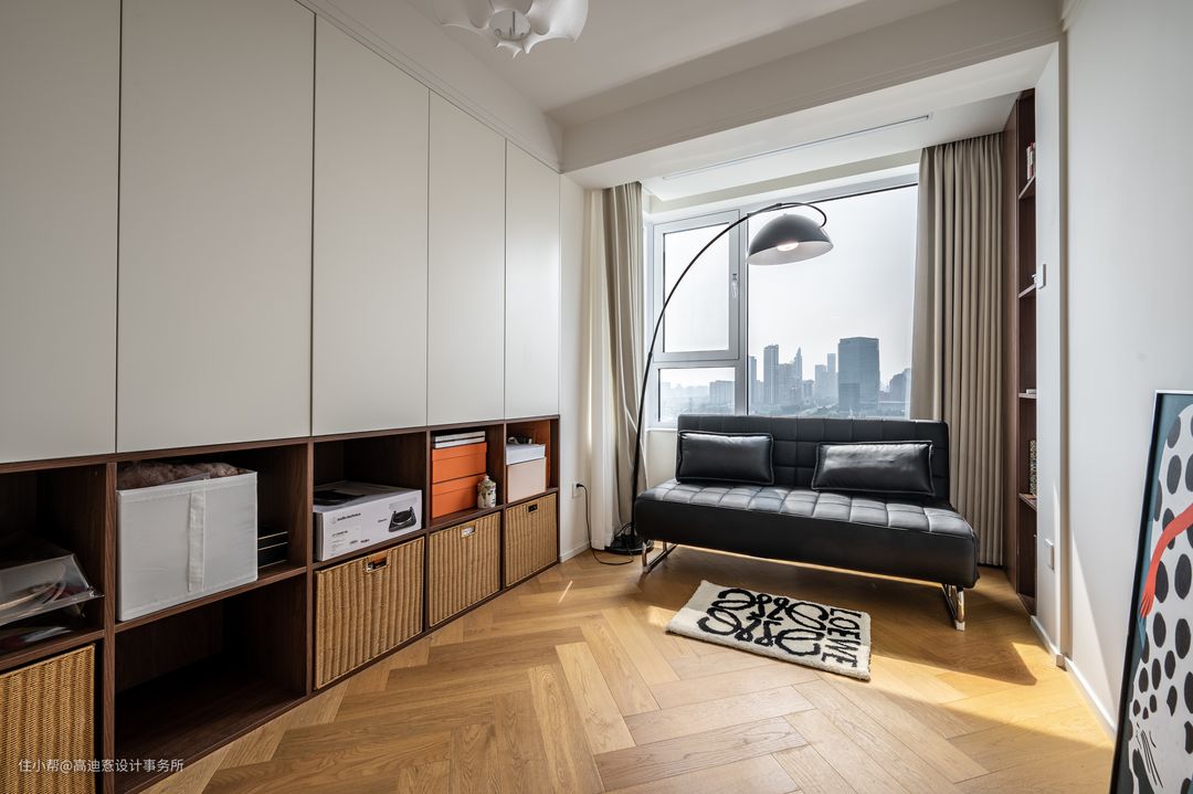 ■ 次卧改造为多功能房,柜体做封闭单元+开放格,互为补充,可用三两装饰摆件妆点。 ■ 可躺可坐的轻盈沙发床让空间更灵活,为未来的区域功能转变提供更多可能,二人世界到三口之家的过渡随时都能实现。