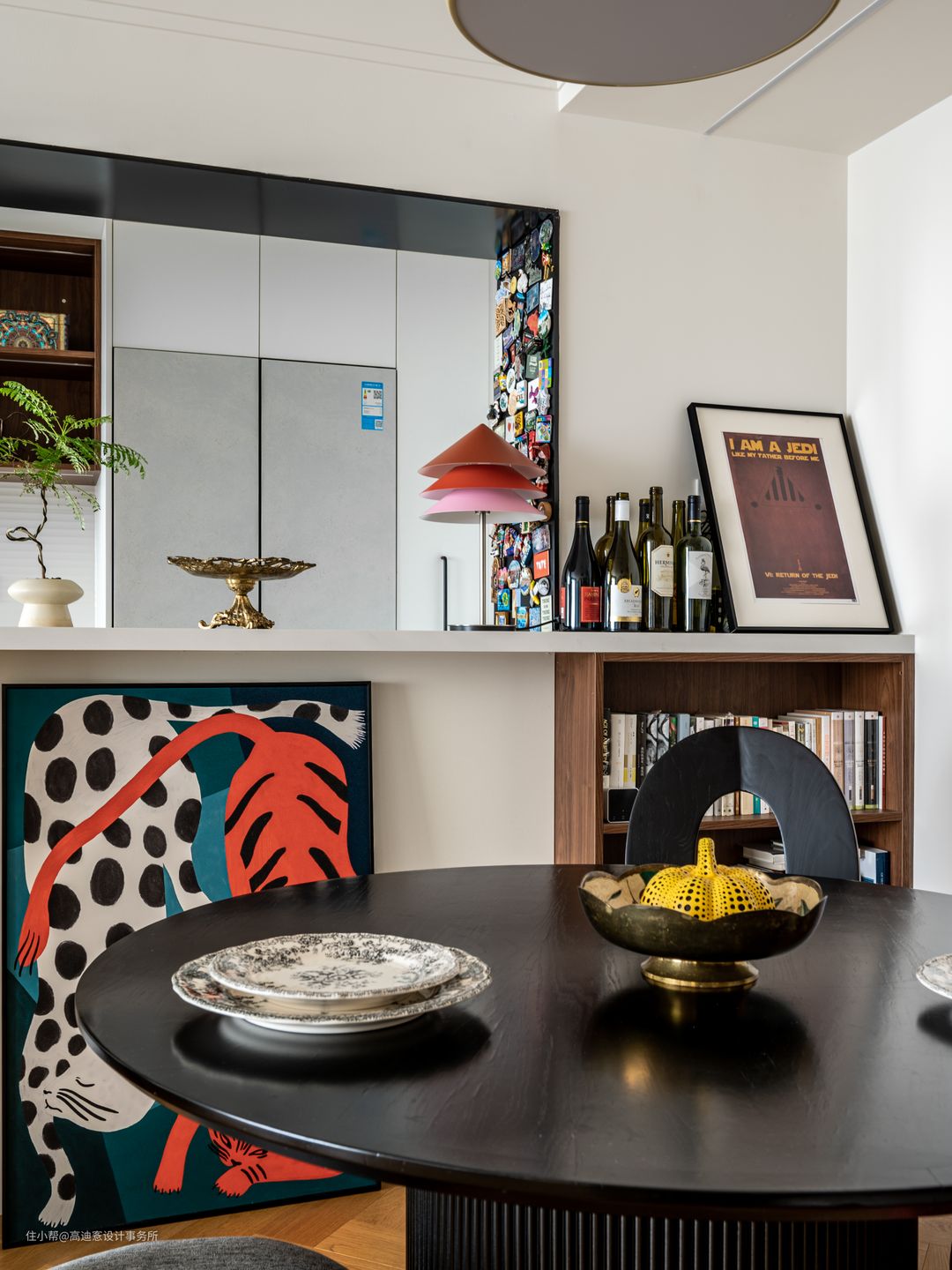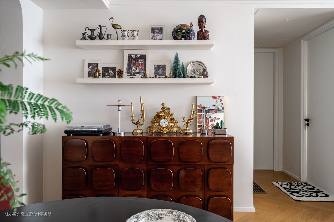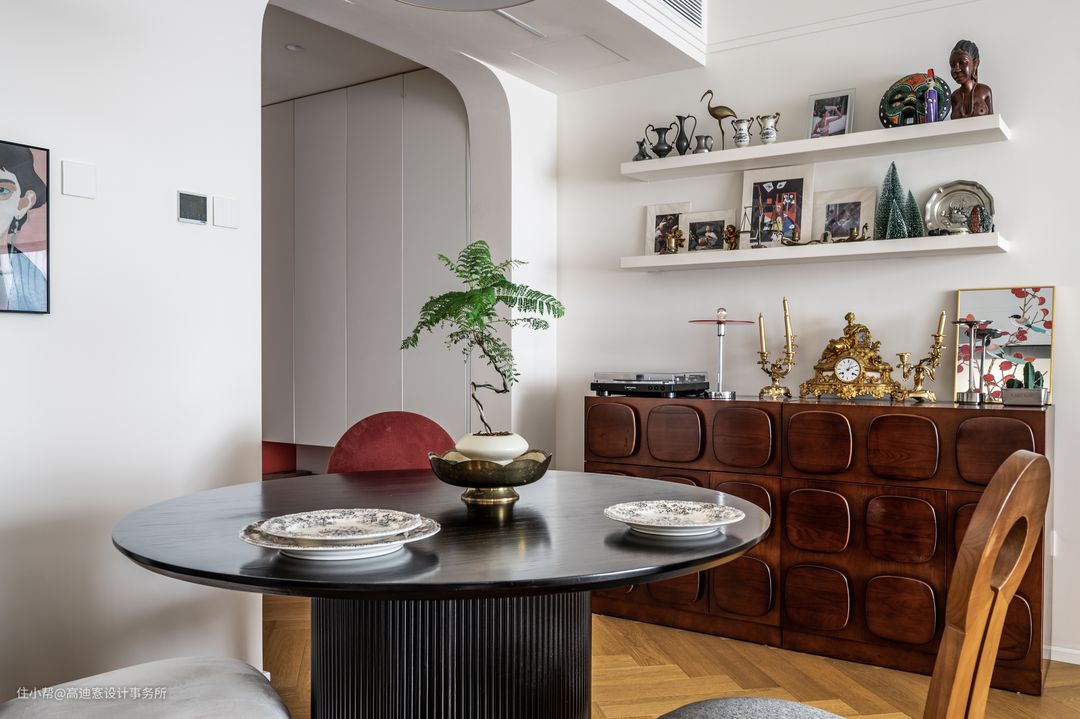 ■ 餐厅由罗马柱圆桌充当C位,搭配多把北欧风单椅,满足多人用餐需求的同时艺术感十足。 ■ 复古斗柜作为餐厅的补充收纳,台面与支架放置的都是业主私藏的摆件,呈现出极具个人风格的美学观感。