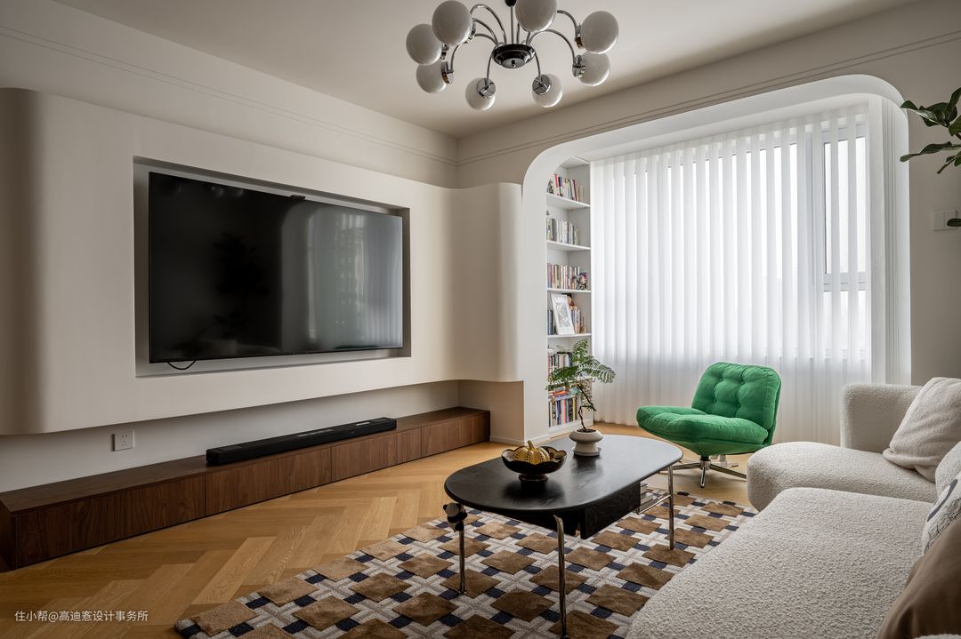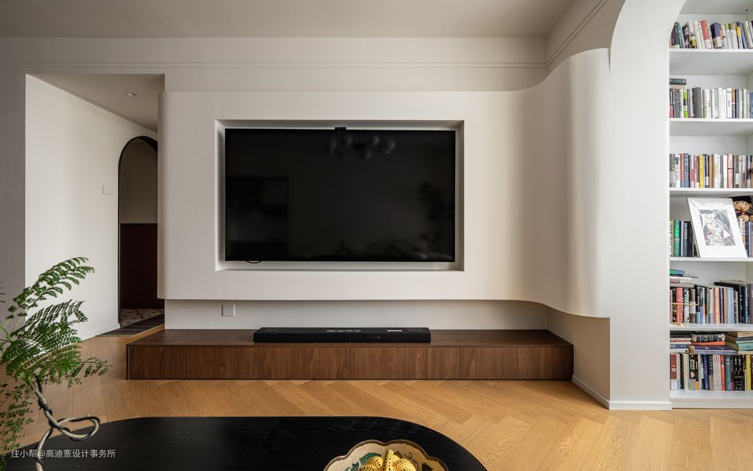 弧形悬浮电视背景墙增加了空间的层次感,轻盈灵动,转角处由弧线化解掉结构的生硬感。