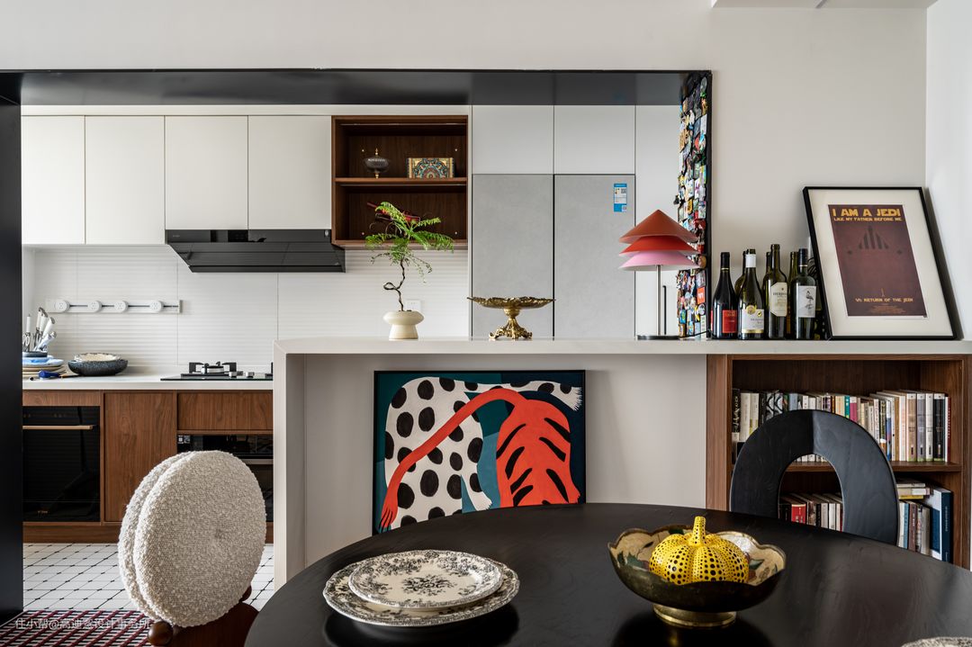 ■ 原厨房封闭性较强,无任何亮点,在拆除厨房部分墙体后,将餐厅与厨房连通,模糊框架下的边界感,开阔明亮。 ■ 别出心裁的吧台设计为餐厨赋予更多变化,也为业主创造可供社交、娱乐的家庭枢纽。吧台右侧的开放书架贯彻分散式收纳的精髓,补充了全屋功能。 ■ 新建墙体令餐厅的面积分配相较之前更为合理宽裕,公共区域的整体比例更加协调,同时也为餐厅收纳提供了更多利用空间。