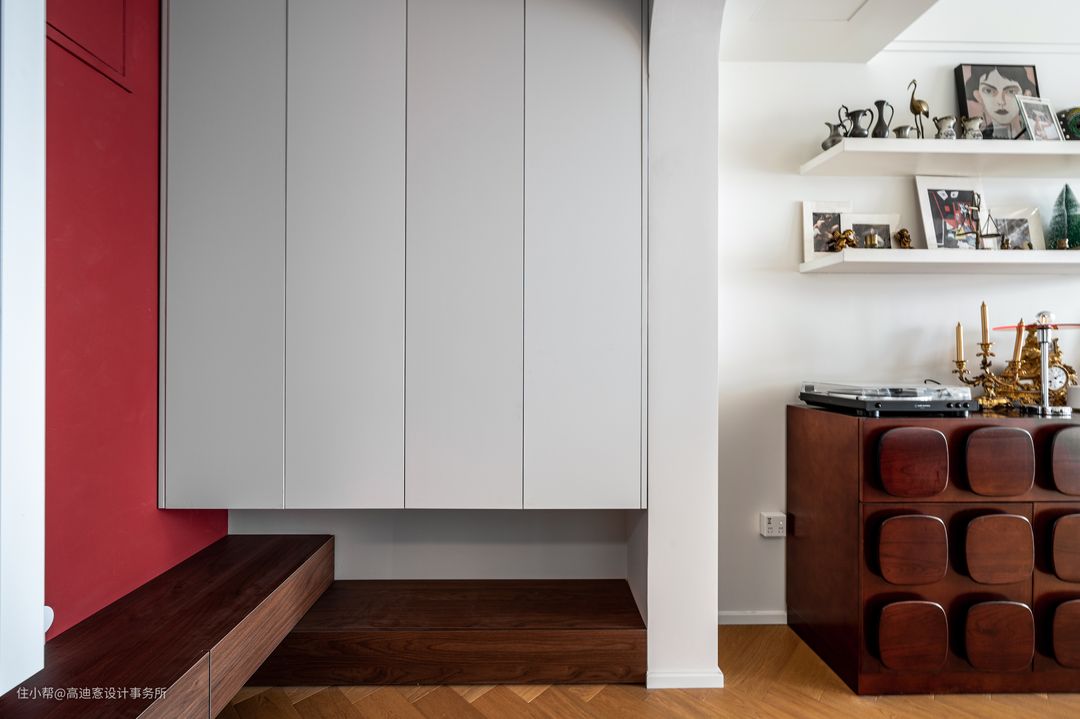■ 独立玄关区使入户动线的过渡更丝滑。饱含热情且低调内敛的暗红漆面做玄关背景,与柜体颜色呈现反差,视觉上更富有层次。 ■ 三处矮柜叠放,搭配悬空的纯白吊柜,错落有致,留白恰到好处。角度变化、颜色反差、邻近渐变、奇数排列,趣味设计带来活力。 ■ 有对称,顶面与吊柜同色,地板与矮柜同色;有失衡,以木色矮柜为锚,墙面偏深,选用时尚的暗红漆,地板偏淡,浅棕的鱼骨拼条纹经典耐看。