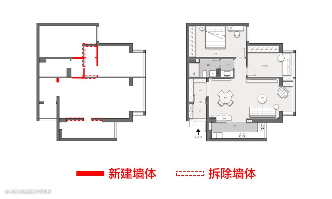 1、通过缩减次卧面积,重新定义了公区的布局,使餐厅与客厅的空间分配更为合理。 2、厨房部分墙体被拆除,转为开放式空间。吧台设计让空间更通透,打造社交与烹饪兼具的理想场所。 3、卫生间改造同样注重实用与舒适,通过延伸深度、设立独立干区,提升空间使用效率。