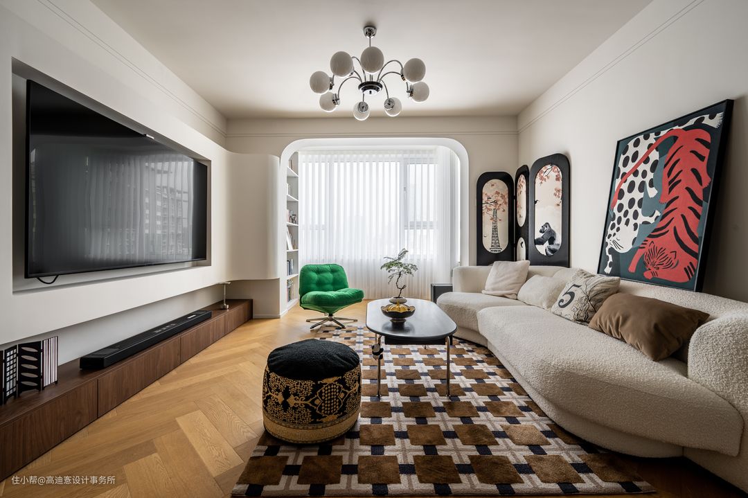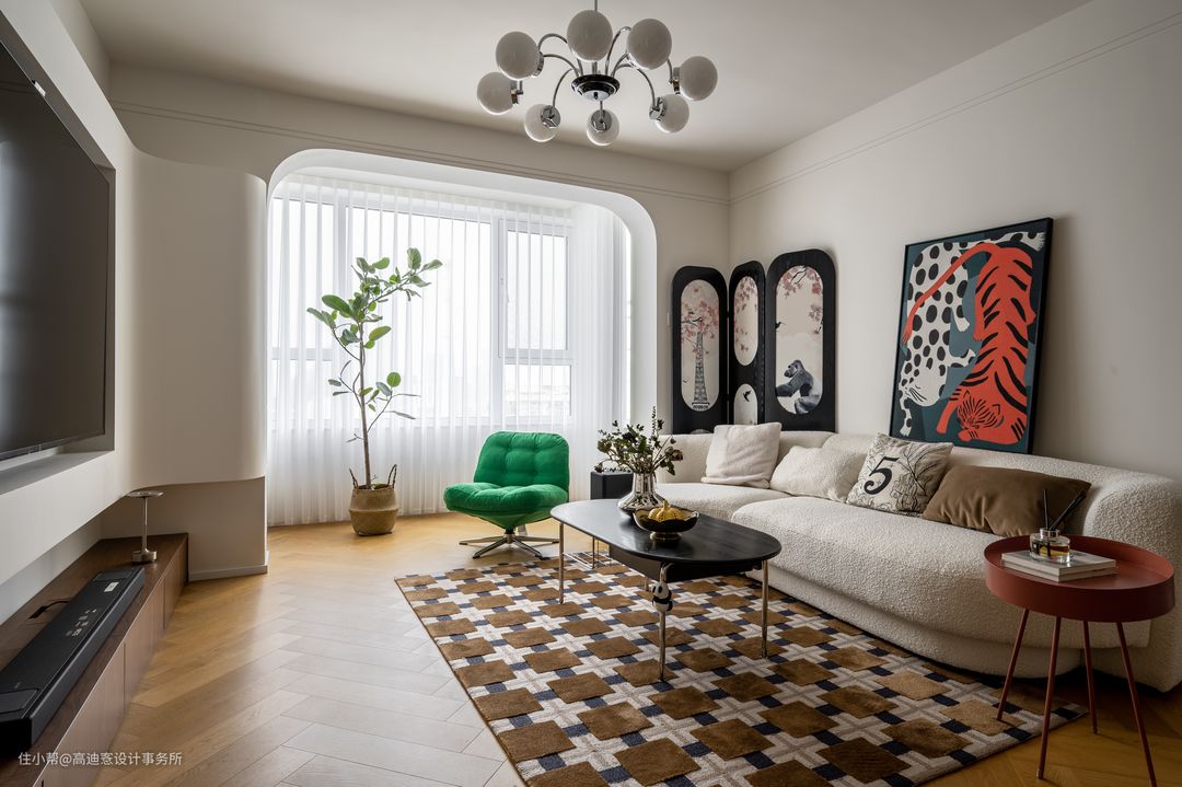 ■ 奶呼呼的羊羔绒异形沙发满足区域功能,同时高度顺应整体风格。 ■ 置入花鸟图案的法式屏风,新颖雅致。 ■ 茶几、边几等功能性单品以简约利落为主导,形制轻盈的特性弱化了视觉上的压抑、厚重。 ■ 满满中古感的棕格地毯为客厅营造出复古氛围。 —— 客厅空间实现了多种材质与颜色的混搭后,依旧呈现出多层细节之上的完整感。
