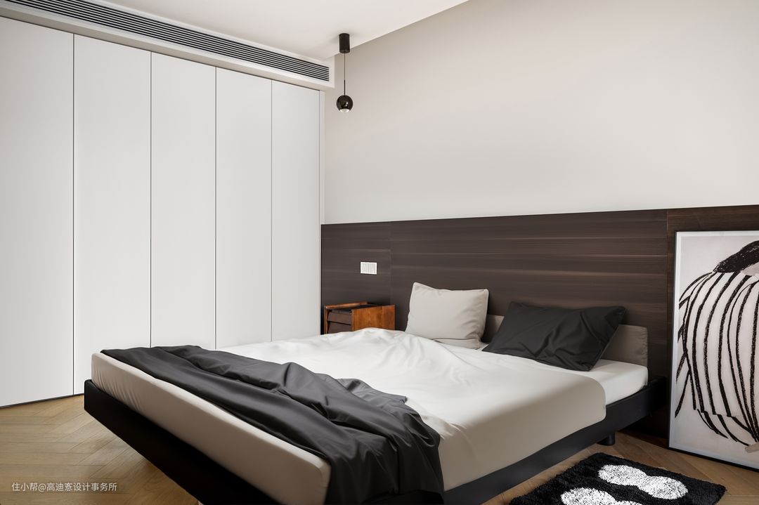 ■ 主卧以简约舒适为主,浅色基调舒缓温馨,打造沉浸感更足的休憩之所。 ■ 深色木质半墙使视觉重心下沉,增添层次。 ■ 整排通顶衣柜+免拉手设计,实现极简利落的收纳美学。